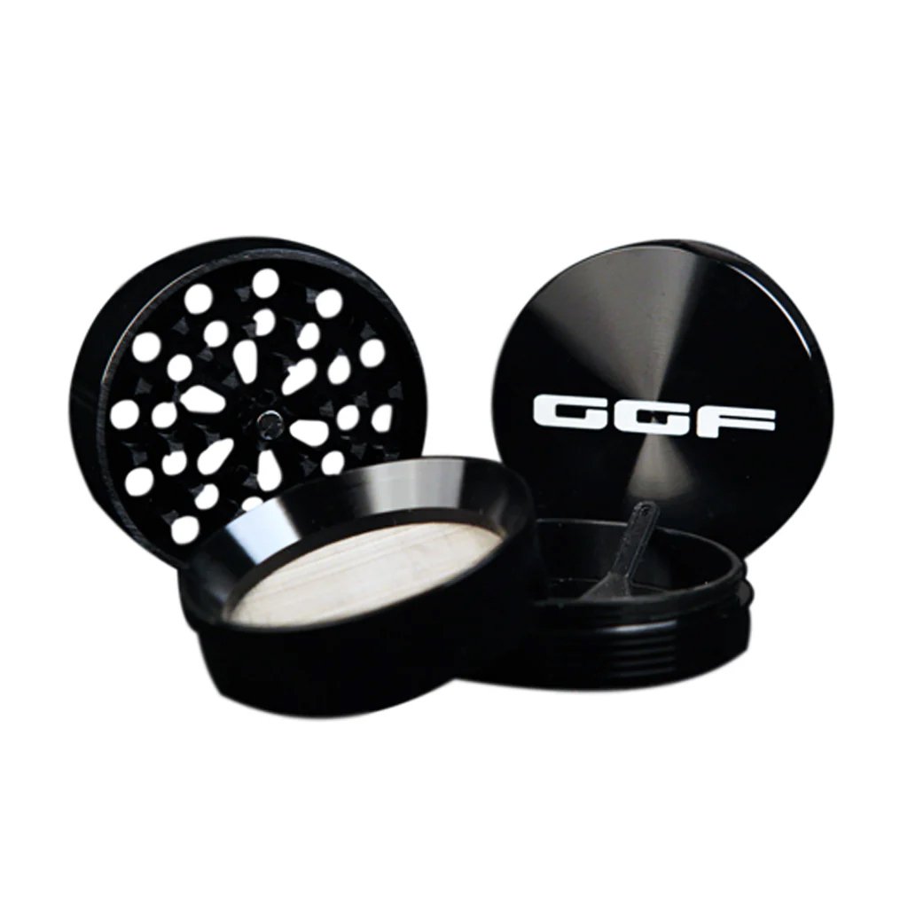 Stupendo grinder composto da 4 parti e 3 livelli, con un altezza di 37 mm, un diametro di 62 mm, ed è di colore nero con stampato il logo GGF di colore bianco.