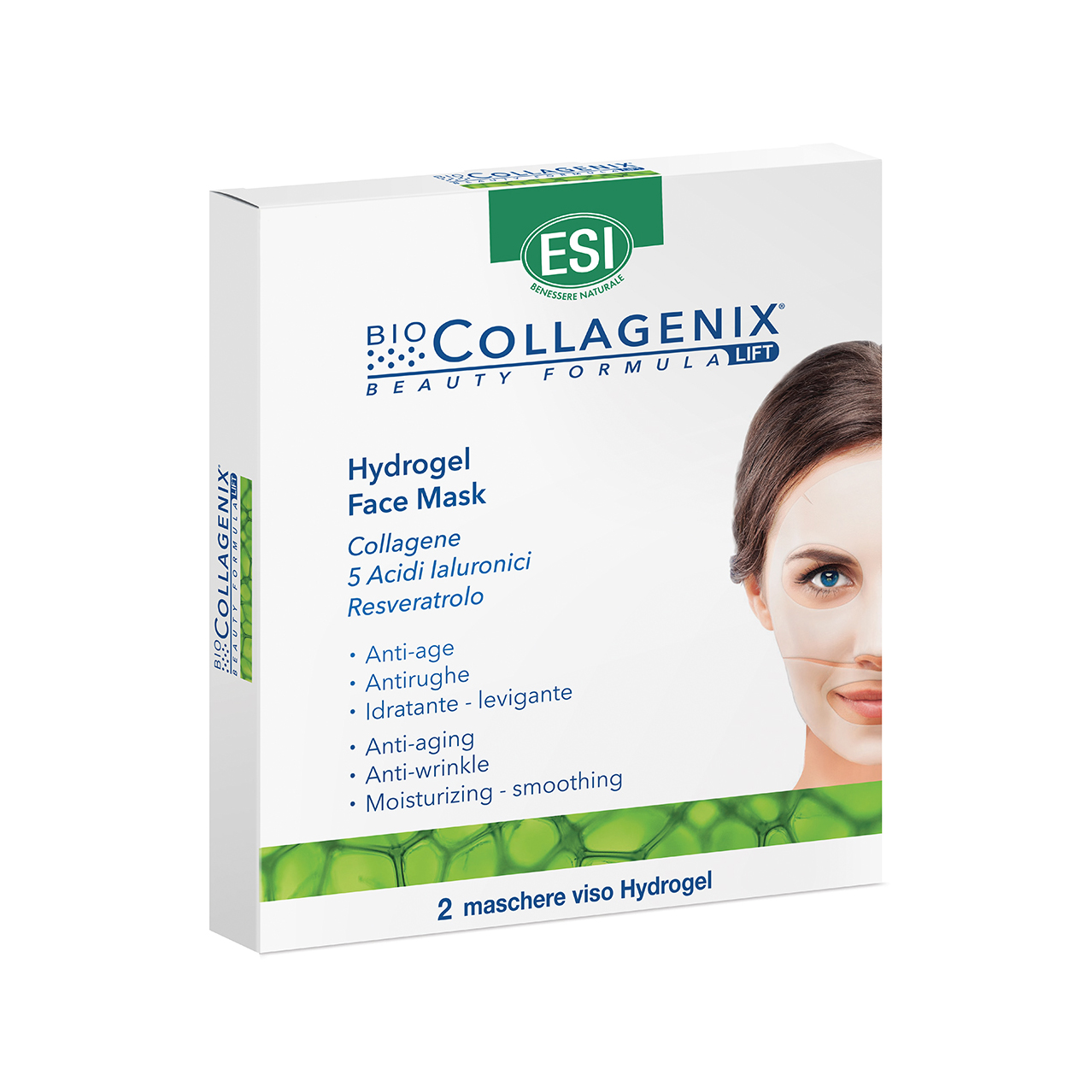 Maschera per il trattamento del viso, realizzata con uno speciale hydrogel contenente unconcentrato di principi naturali: collagene marino di tipo I e III, resveratrolo, 5 acidiialuronici con diversi pesi molecolari per limitare l’evaporazione dell’acqua dalla cutee preservarne l’elasticità.