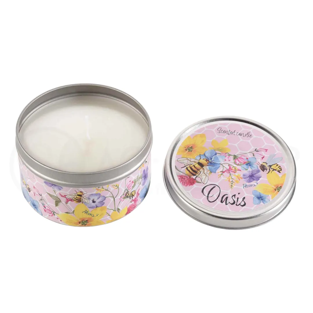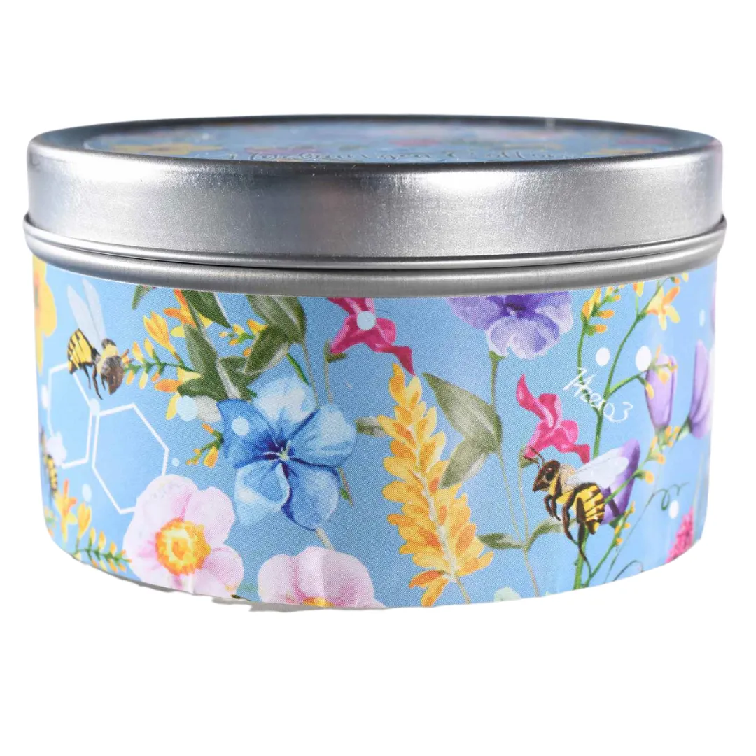 Candela profumata in scatola di metallo rotonda fiori e api