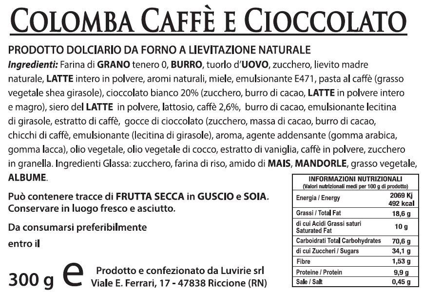 Colomba Pasquale, Caffè e Cioccolato: colomba artigianale di alta qualità, dalle mani di Bernadette (la pasticcera del nostro laboratorio) con lavorazione interamente interna e prodotti locali dell’entroterra romagnolo (come farina di mulino e burro artigianale a km zero).