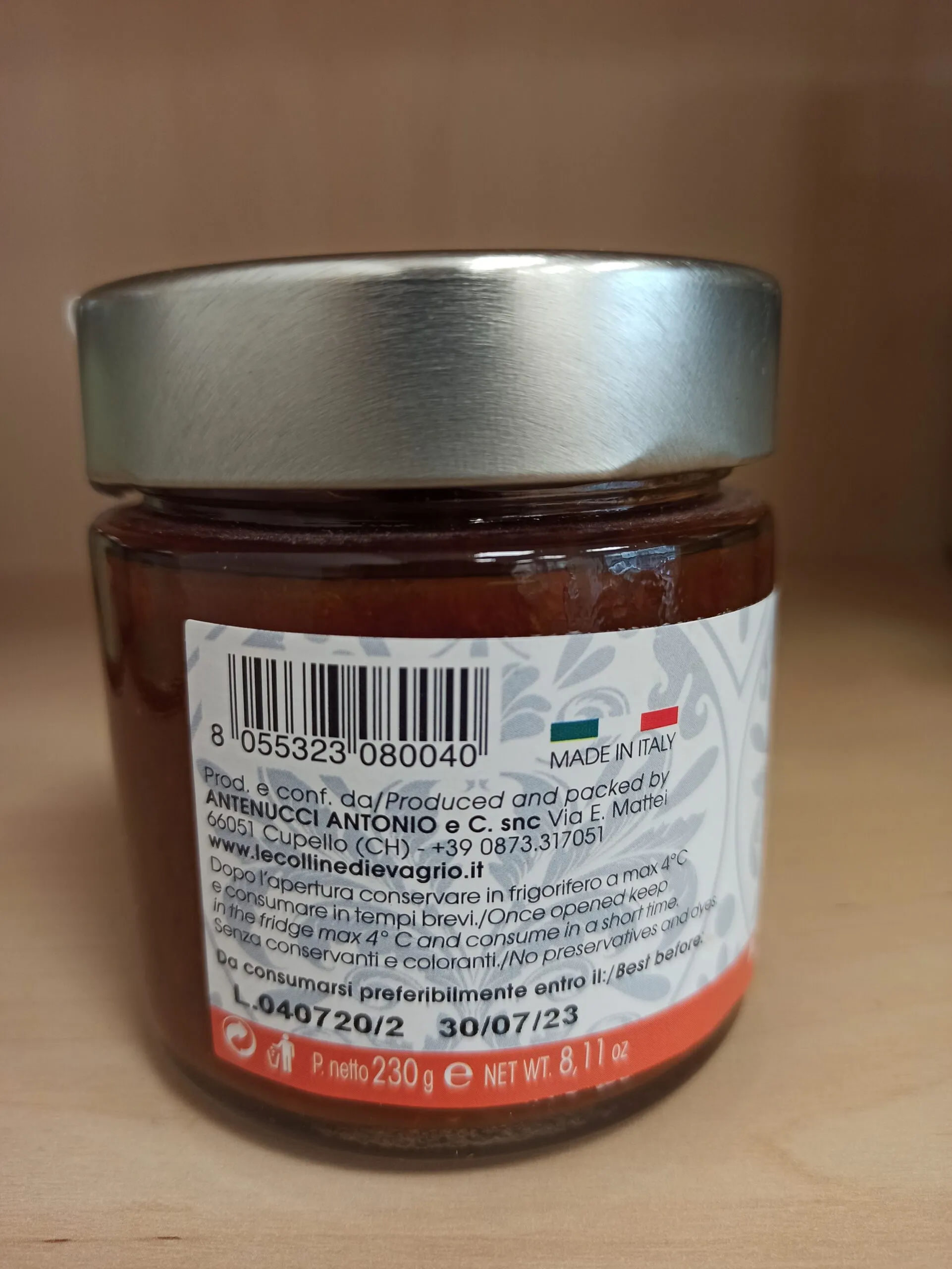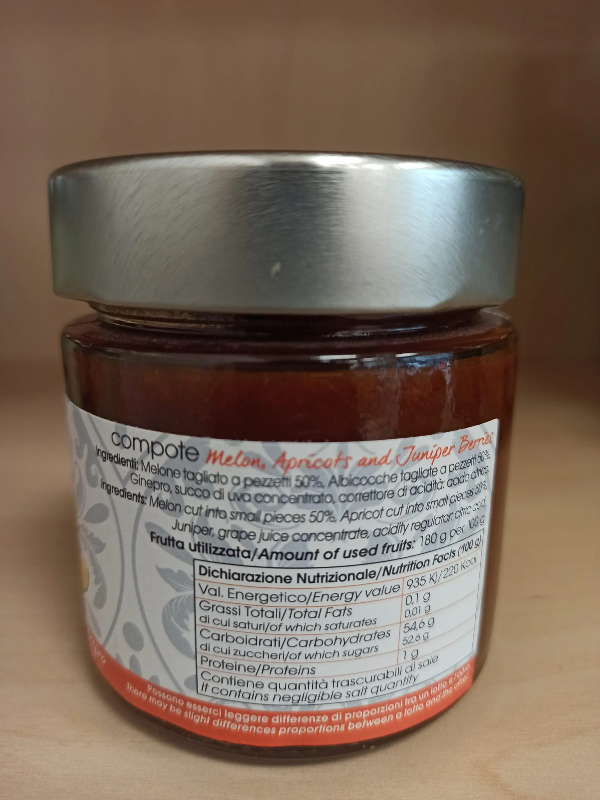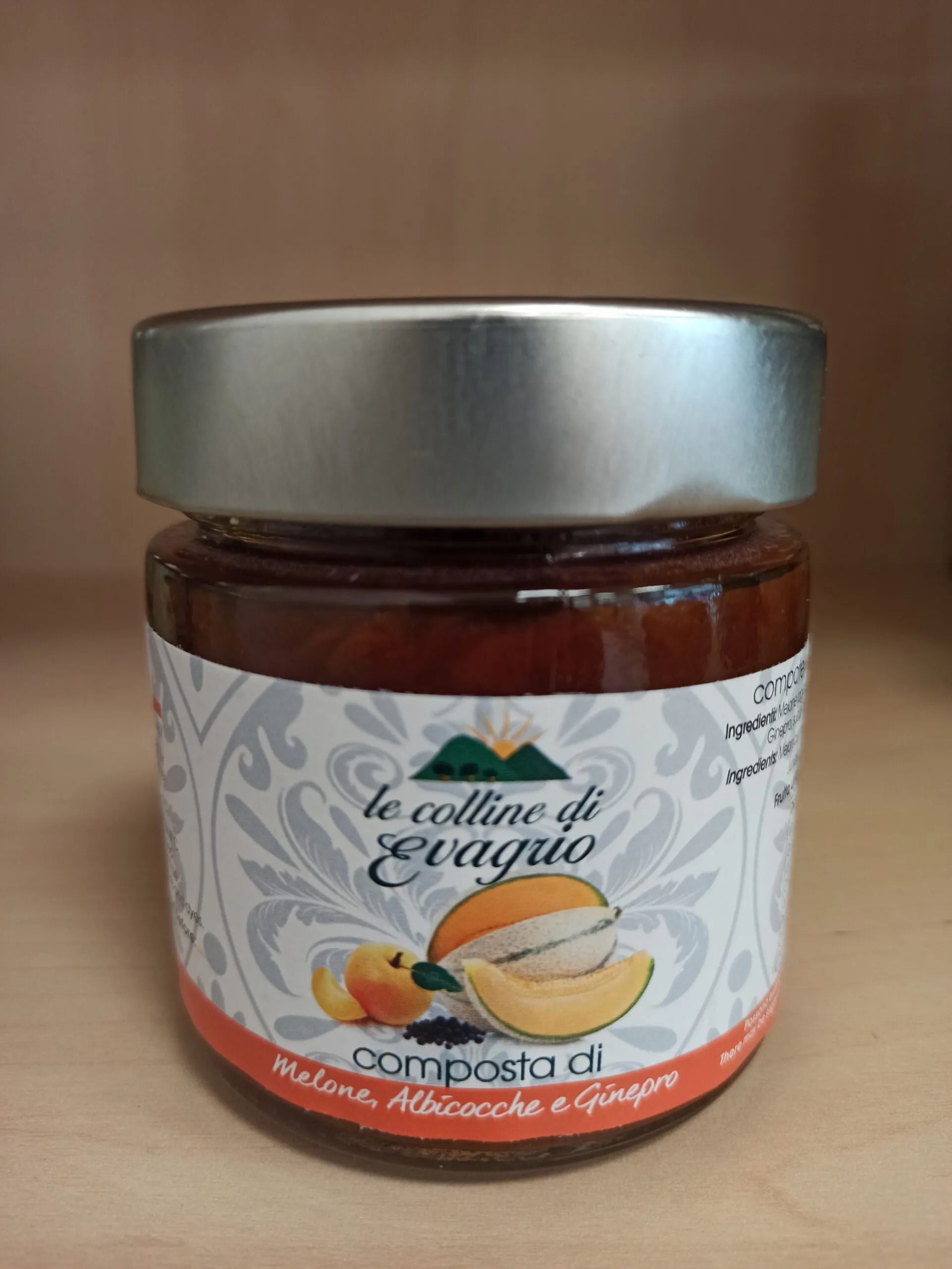 La composta di melone, albicocche e ginepro è prodotta artigianalmente da Le Colline di Evagrio.