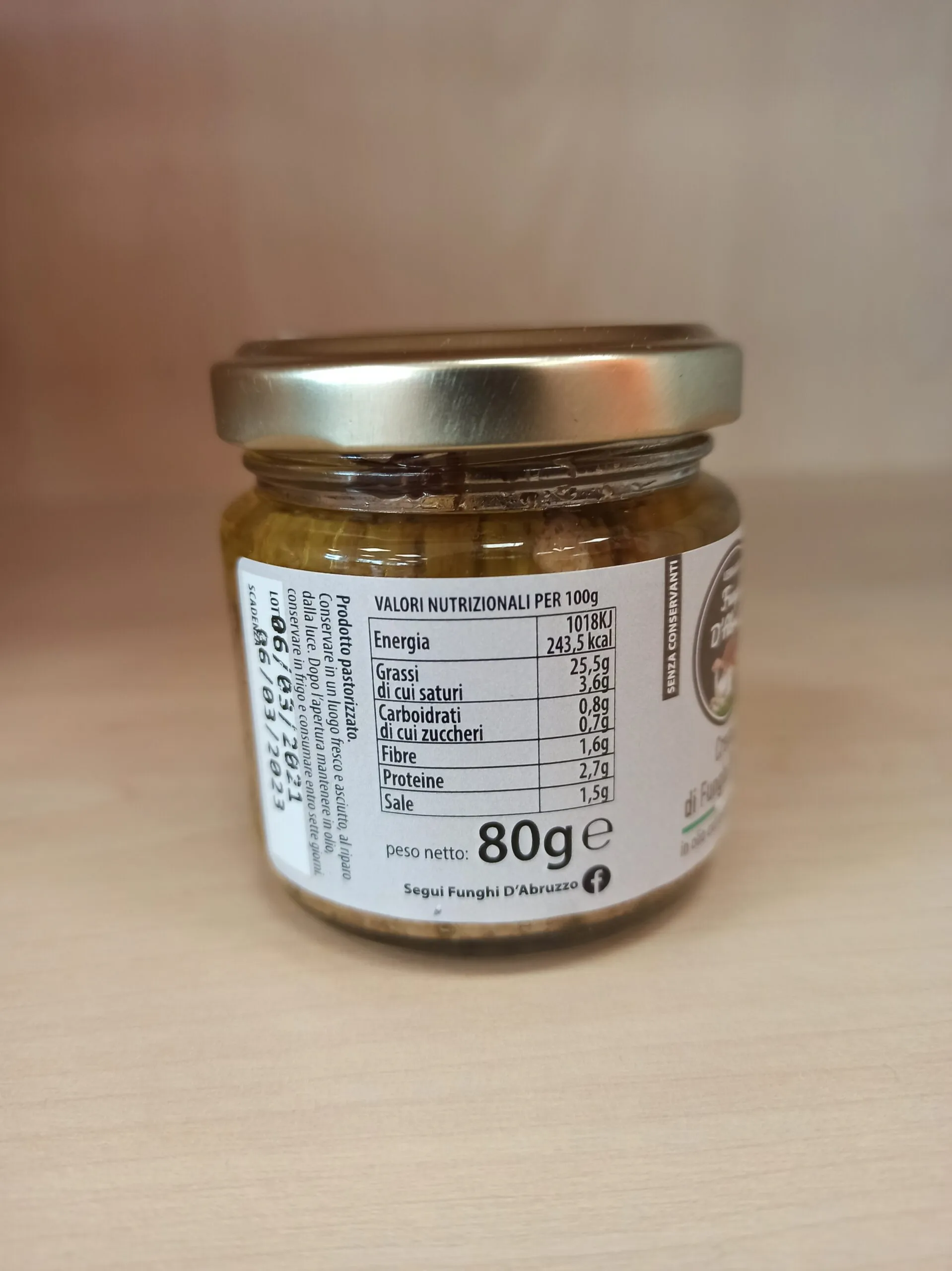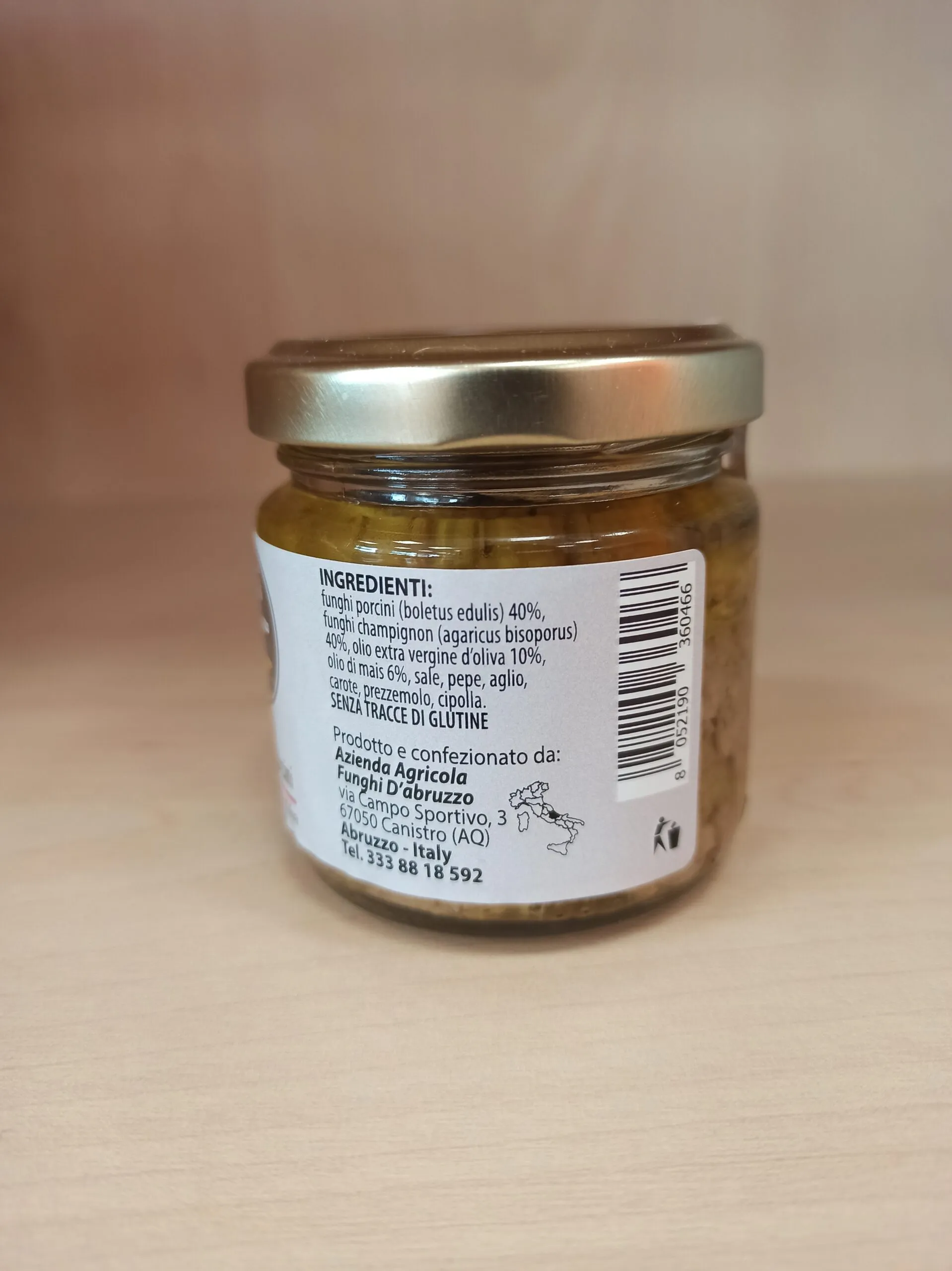 champignons (Agaricus bisporus) 40%, olio extra vergine d’oliva 10%, olio di mais 6%, Sale, pepe, aglio, carote, prezzemolo e cipolla. Senza conservanti o tracce di glutine.