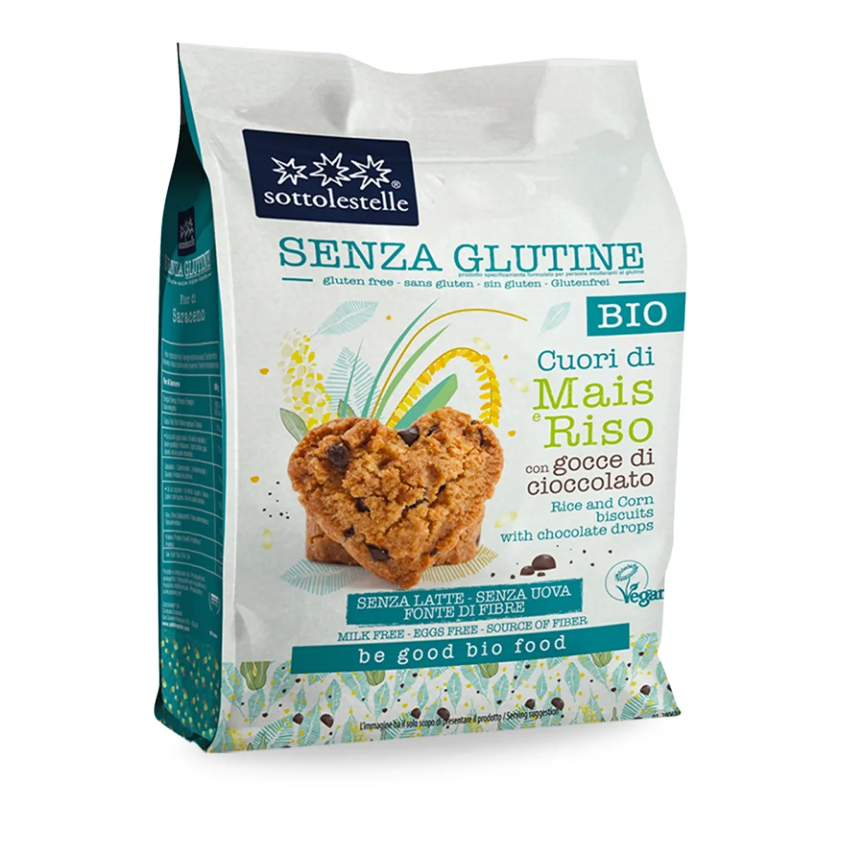 Amido di mais* 30%, zucchero di canna*, olio di girasole*, farina di mais* 14%, gocce di cioccolato* (pasta di cacao* 53%, zucchero di canna*, burro di cacao*) 9%, farina di riso* 8%, sciroppo di riso*, carbonati di ammonio.