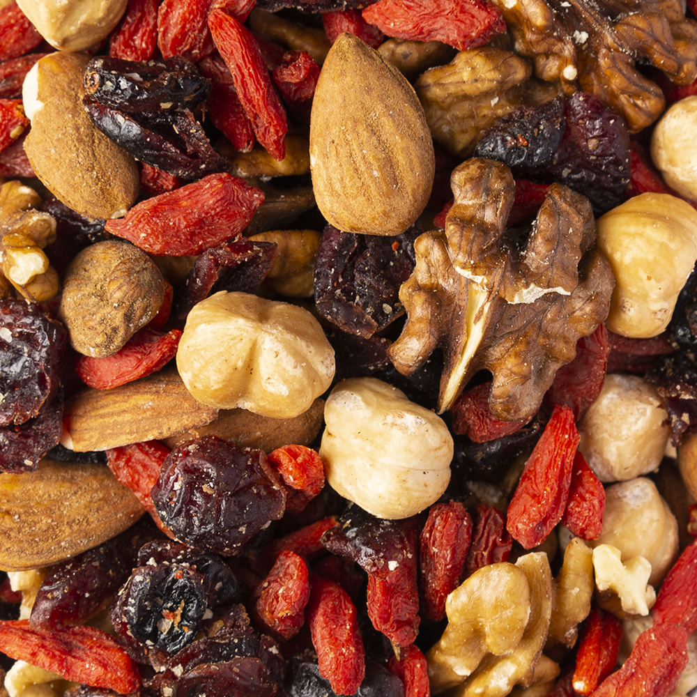 L’energy mix è composto da mandorle naturali, mirtilli disidratati, bacche di goji, noci sgusciate e nocciole tostate. La combinazione dei sapori e l’equilibrio tra i livelli di apporto calorico, proprietà nutritive e grassi “buoni” lo rendono il prodotto ideale per uno snack che doni un grande apporto energetico ma senza pesare sulla linea. Perfetto per chi fa sport.