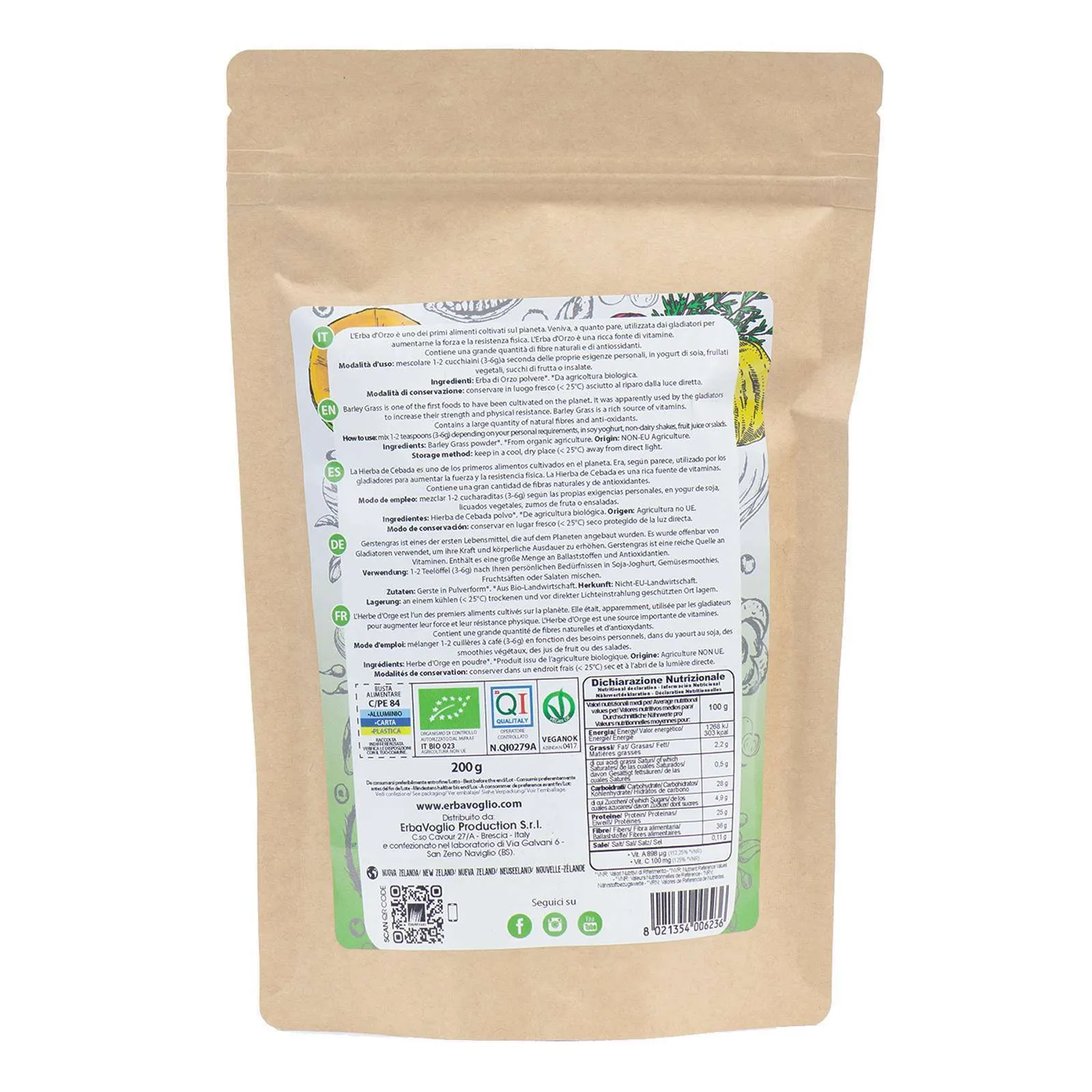 La polvere di Erba d’Orzo, ottenuta dalla macinazione dell’erba giovane d’orzo, proviene da agricoltura biologica. È priva di additivi e coloranti e presenta un sapore naturalmente dolce.