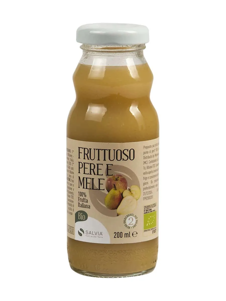 Fruttuoso pere e mele è fatto con purea di pere e succo di mele mescolate in parti uguali per creare una piacevole bevanda di sola frutta Biologica, senza aggiunta di acqua, zucchero o altri dolcificanti o qualsiasi altra sostanza come additivi, conservanti, …, perfetta quindi per godere appieno di tutti i benefici della frutta.