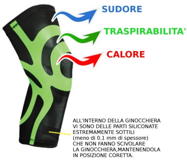 All’interno della ginocchiera vi sono delle parti siliconate estremamente sottili ( meno di 0,1 mm di spessore ) che impediscono alla ginocchiera di scivolare mantenendo la posizione corretta.