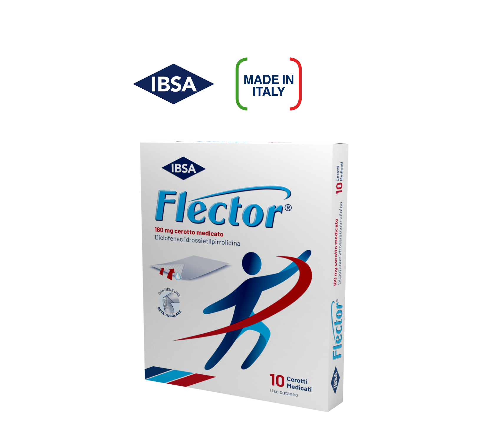 Flector® è un cerotto medicato a base di Diclofenac, un principio attivo antinfiammatorio non steroideo per uso cutaneo. La salificazione del Diclofenac con l’epolamina permette di facilitare l’assorbimento e la concentrazione del principio attivo nella zona colpita dal dolore e dall’infiammazione, favorendo una rapida ma prolungata azione farmacologica antinfiammatoria e analgesica.