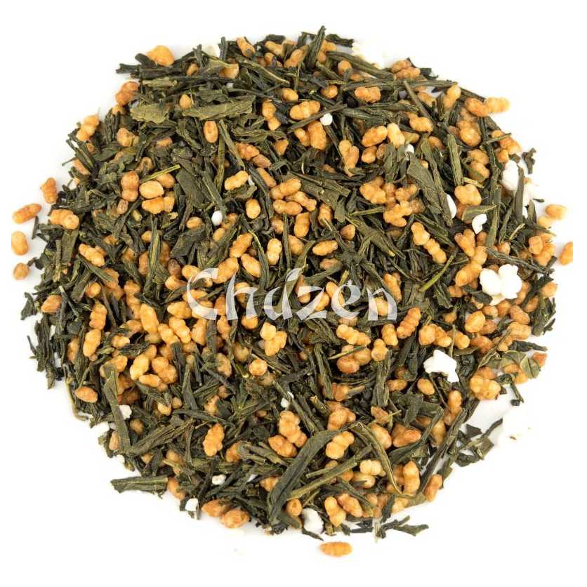 Tè verde giapponese bancha, con riso soffiato e tostato. Il Genmaicha è un tè verde giapponese a base di foglie di tè bancha miscelate con riso tostato e riso soffiato.