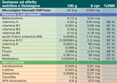 Klamath RW®max della linea Nutrigea, grazie a nuovi e superiori metodi di lavorazione ed essiccazione, mantiene oltre 100 tra nutrienti (vitamine, minerali, aminoacidi, acidi grassi Omega3) e molecole nutriceutiche (ficocianine, polifenoli, caroteni, clorofilla, ecc.) ma migliora a tal punto la concentrazione da contenere ben 12 vitamine e minerali LARN-rilevanti, da coprire cioe’ in maniera signficativa il fabbisogno giornaliero.