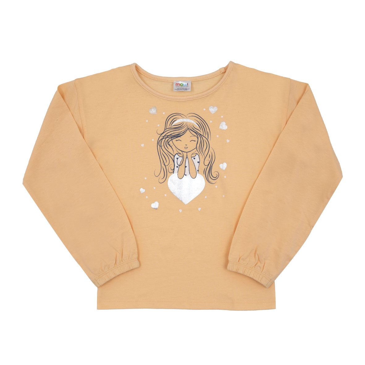 Maglia casual a maniche lunghe da bambina. Il capo si presenta in colorazione arancione chiaro con stampa cuori sul davanti La vestibiilità è morbida e pratica. Modello girocollo. Il capo è facilmente combinabile per vari look. Accessori non in vendita. La confezione contiene solo il capo d’abbigliamento