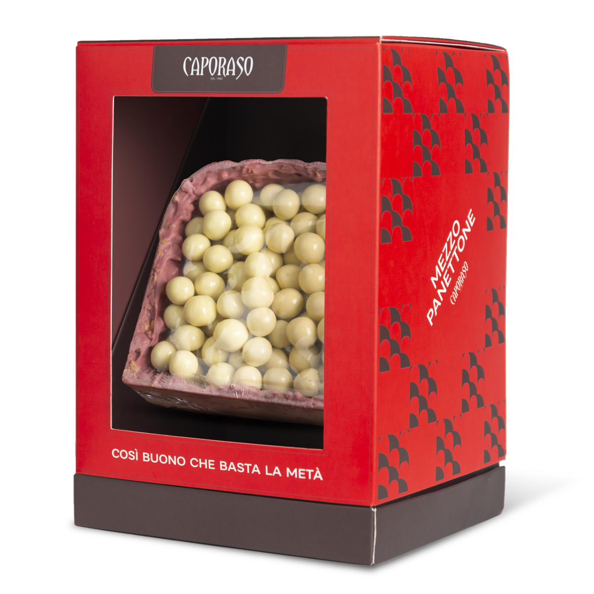 Il Mezzo Panettone farcito di Caporaso: in edizione speciale con Mezzo Panettone al Cioccolato Ruby e granella di Nocciola (dal peso di 400g), aperto nel mezzo e farcito con 400g di Nocciole ricoperte al cioccolato bianco di Caporaso.