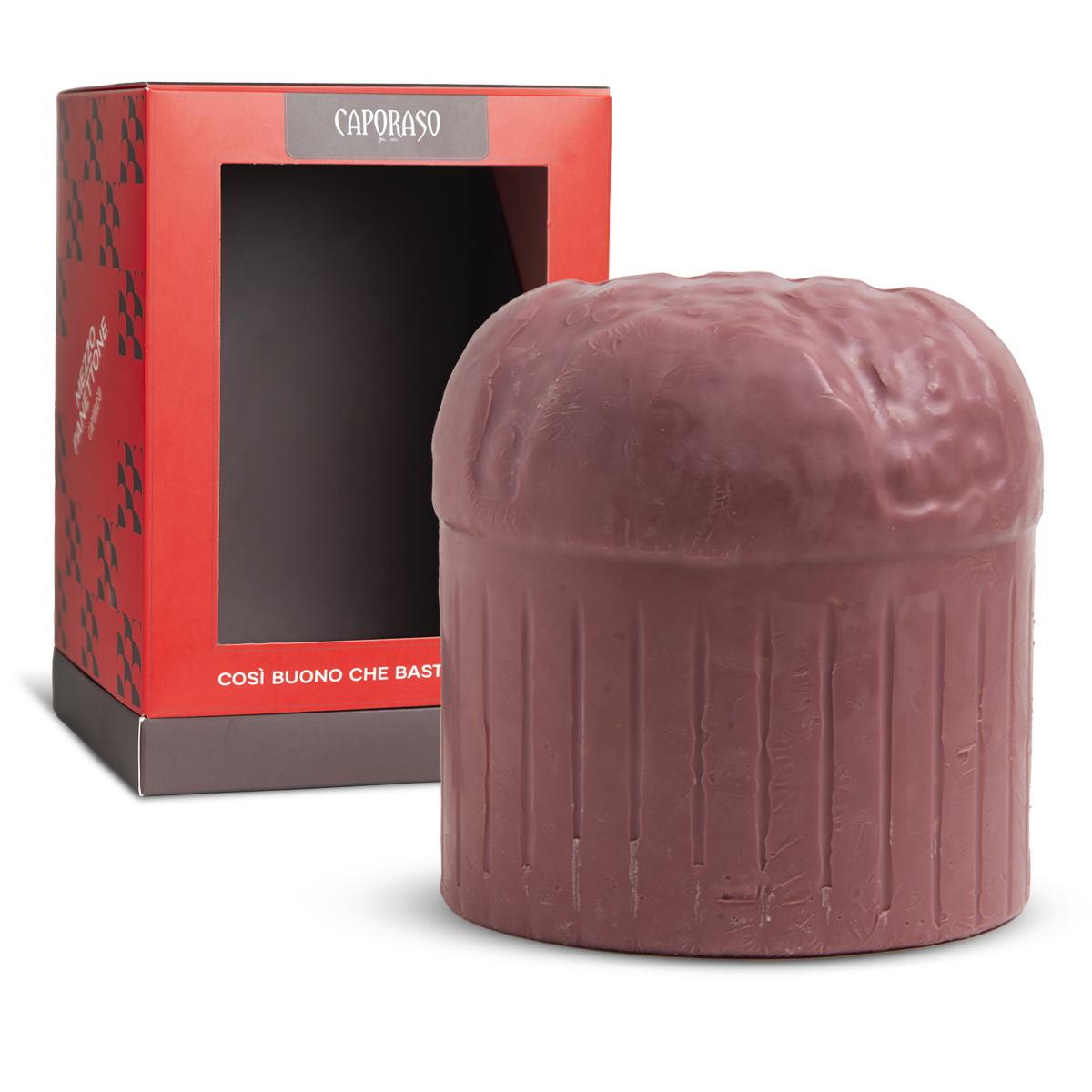 Edizione speciale con Mezzo Panettone al Cioccolato Ruby e granella di Nocciola (dal peso di 400g), aperto nel mezzo e farcito con 400g di Nocciole ricoperte al cioccolato bianco di Caporaso.