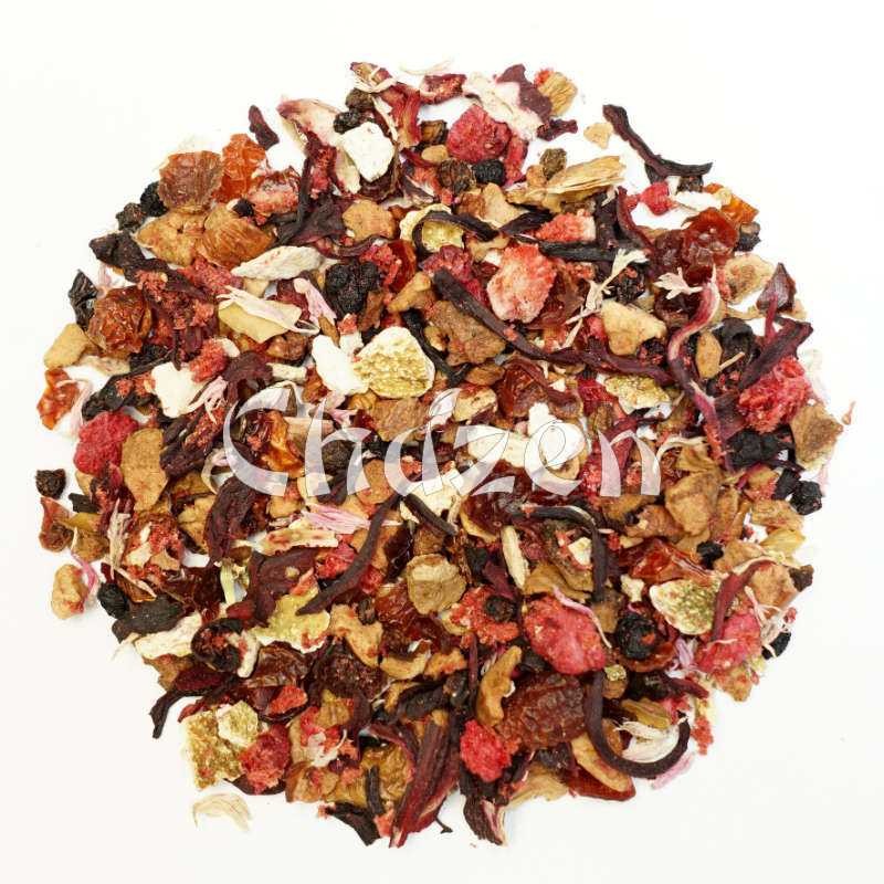 Ingredienti: pezzi di mela, ibisco, bucce di rosa canina, bucce di arancia, bacche di sambuco, pezzi di lampone liofilizzati, pezzi di fragola, petali di fiordaliso rosa.