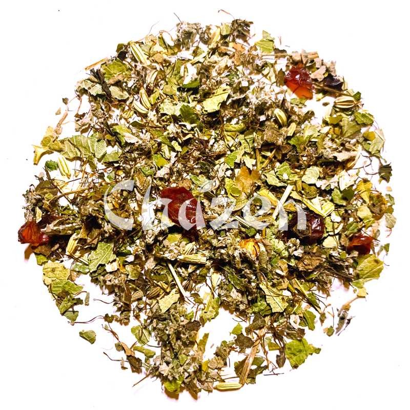 Ingredienti: mate verde, bucce di rosa canina, foglie di lampone, foglie di bacche nere, foglie di ribes, anice, finocchio, mais.