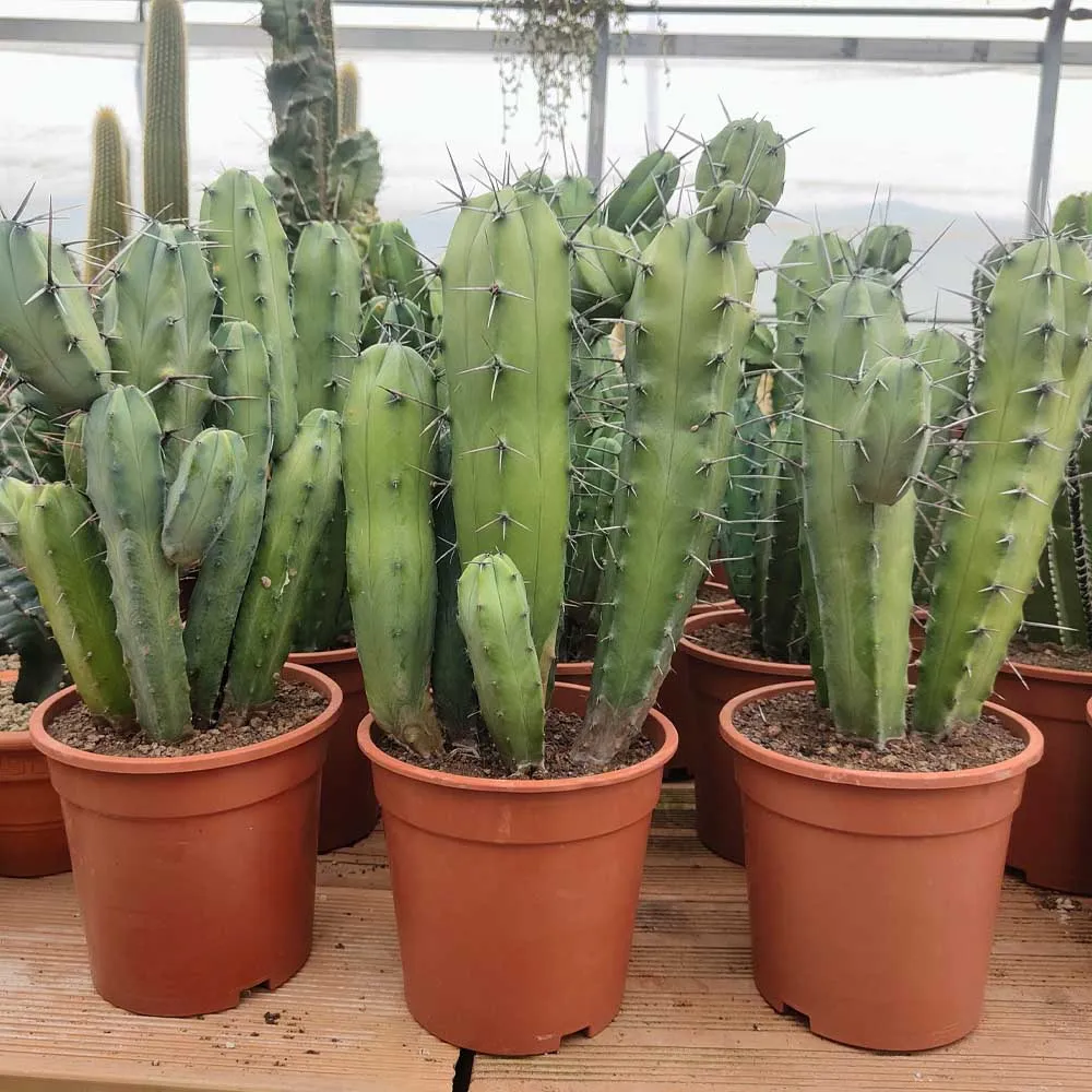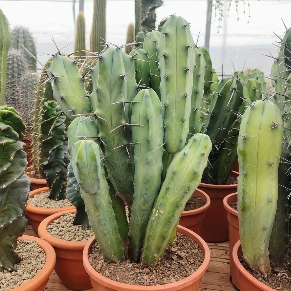 Il Myrtillocactus geometrizans è una pianta grassa dalla tipica forma colonnare: fusti caratterizzati da ramificazioni molto simili a braccia che ne fanno il classico “cactus” (come Polaskia Chichipe, Euphorbia eritrea etc). Il suo riconoscibile colore è verde azzurro che a seconda di stagione e temperature vira le sfumature donando quasi un’ effetto metallizzato; le costolature, marcate e lineari, conferiscono un aspetto geometrico e simmetrico mentre le spine dure dalle tonalità nero grigio ne delineano i contorni. In primavera piccoli e profumatissimi fiori bianchi crescono ai margini della pianta portando ancora più eleganza e charme, ma è dopo la sfioritura che succede la magia: ebbene sì i fiori secchi lasciano il posto ai frutti, di colore blu viola, e proprio identici al frutto mirtillo ed ecco svelato il singolare nome di questa spettacolare pianta grassa. Infine la facile coltivazione e le scarse cure ne fanno una pianta perfetta sia come idea regalo sia come tocco green per ogni spazio interno.