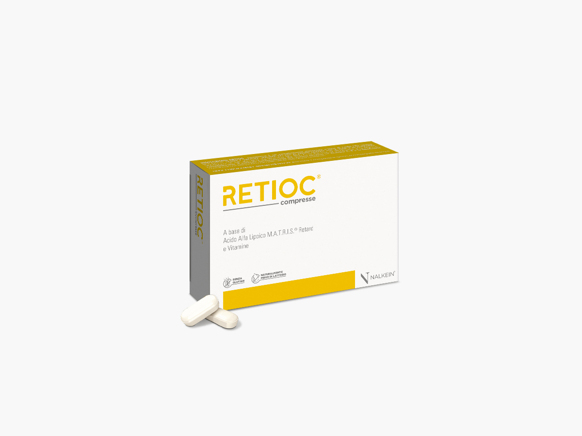 RETIOC® compresse è un complemento alimentare a base di Acido Alfa Lipoico M.A.T.R.I.S.® Retard e Vitamine. Le Vitamine B6 e C, la Tiamina, la Riboflavina e la Niacina, contribuiscono al normale funzionamento del sistema nervoso. Le Vitamine C ed E e la Riboflavina contribuiscono alla protezione delle cellule dallo stress ossidativo.