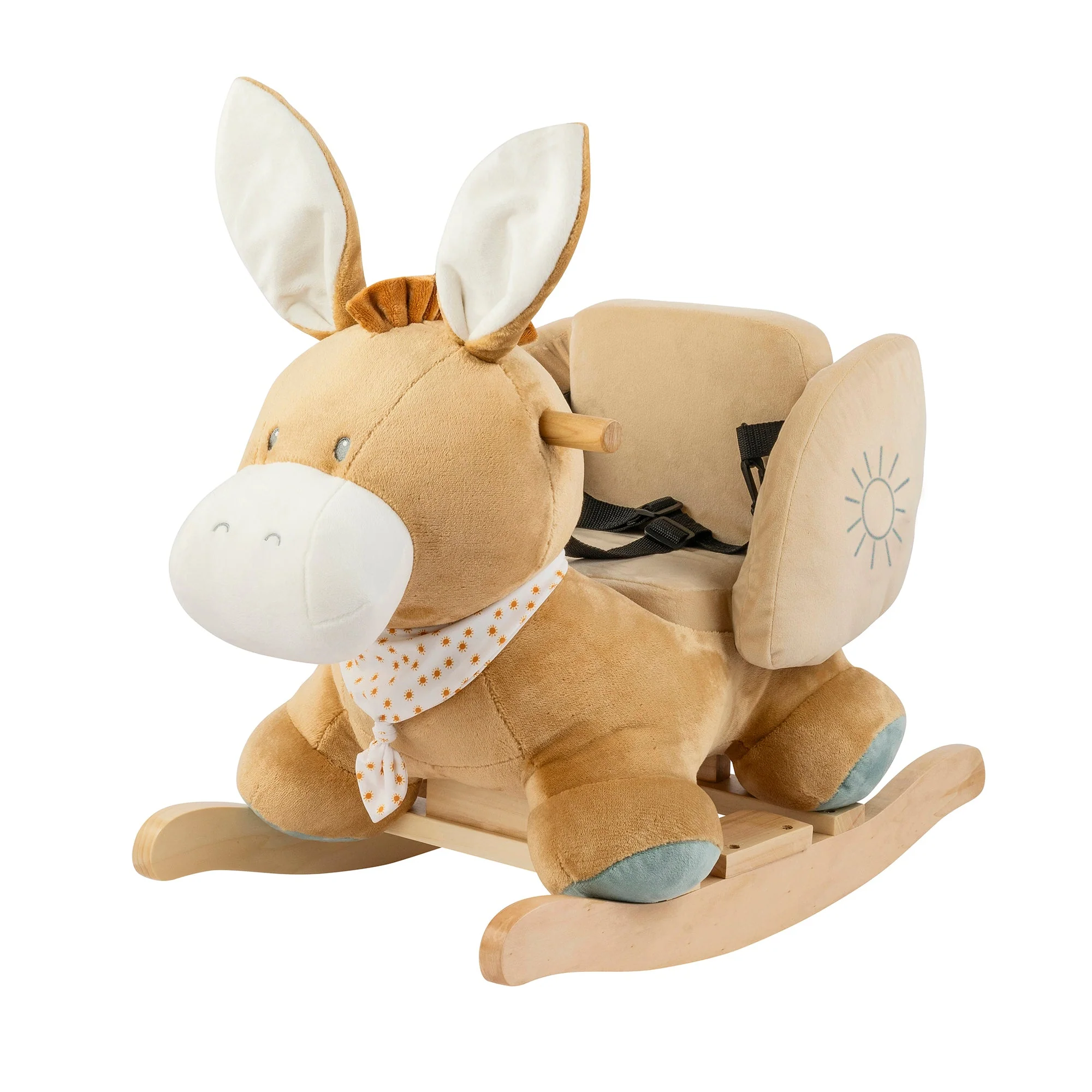Il dondolo è realizzato in soffice peluche con la base in legno, è anti ribaltamento, con una comoda e ampia seduta e maniglie ergonomiche.