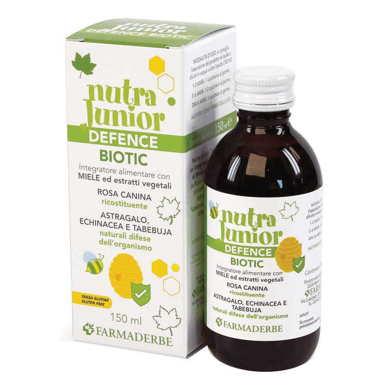 NUTRA JUNIOR DEFENS BIOTIC è un integratore alimentare a base di Miele, Rosa canina, Astragalo, Echinacea, Tabebuja (lapacho) ed estratto di semi di Pompelmo.