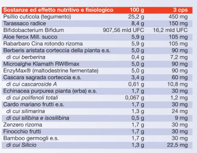 Psillio (Plantago ovata FORSK.) cuticola (tegumento), Tarassaco (Taraxacum officinale -D.C.- web.) radice, Bifidobacterium Bifidum (DSM 25565), Aloe ferox Mill. succo, Rabarbaro Cina rotondo (Rheum palmatum L. var. Tanguticum Max) rizoma, microalghe Klamath RW® max (Aphanizomenon Flos Aquae), EnzyMax® (Maltodestrine fermentate), Berberis aristata DC corteccia della pianta e.s. (8% berberina), Cascara sagrada (Rhamnus Purshiana DC) corteccia e.s. (18-20% glicosidi idrossiantracenici totali espressi come cascaroside A), agente di carica: gomma d’Acacia; Echinacea purpurea (L.) Moench pianta (erba) e.s. (4% polifenoli totali), Cardo mariano (Silybum marianum -L.- Gaertn.) frutti e.s. (80% silimarina, 30% silibina e isosilibina), Zenzero (Zingiber officinale ROSCOE) rizoma, Finocchio (Foeniculum vulgare MILLER.) frutti, Bamboo (Bambusa spp.) germogli e.s. (75% silicio), amido di mais pregelatinizzato, Patata polvere.