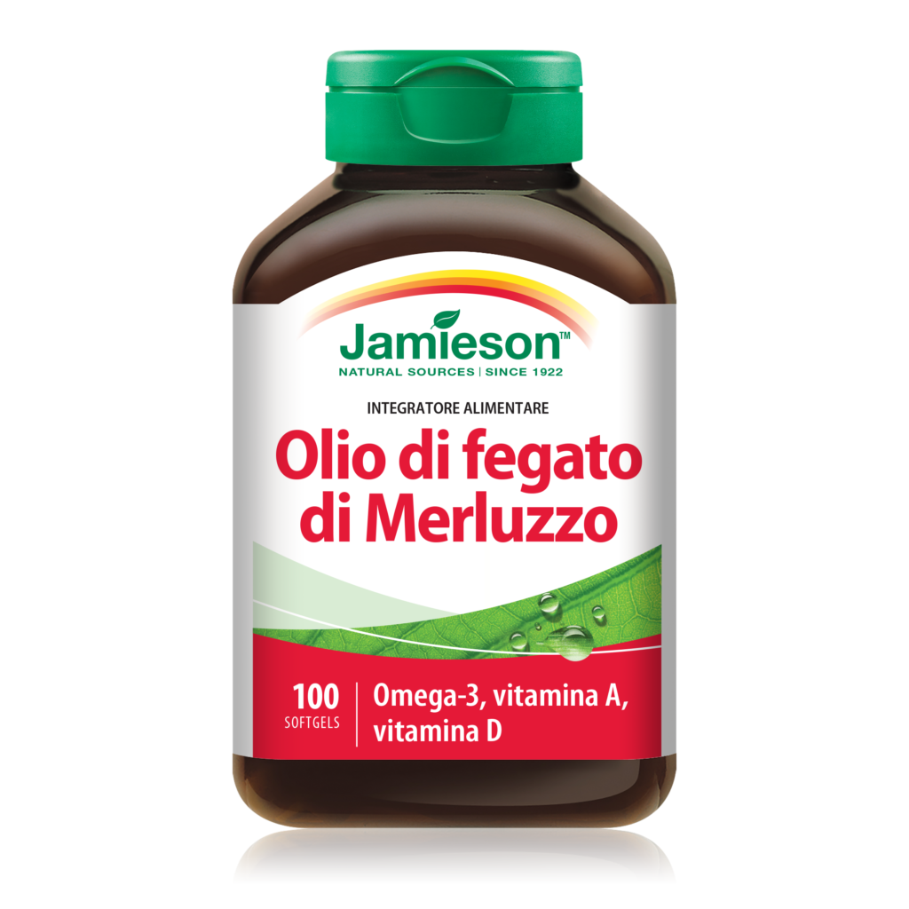 L’olio di fegato di merluzzo è una fonte naturale di vitamina A, vitamina D3, EPA e DHA, acidi grassi polinsaturi della serie omega-3. Gli acidi grassi polinsaturi della serie omega-3 (EPA e DHA) svolgono molteplici effetti benefici sull’apparato cardiovascolare. La funzione principale della vitamina D3 è quella di aumentare l’assorbimento e l’utilizzo di calcio e fosforo, contribuendo al processo di mineralizzazione dell’osso e quindi al mantenimento di ossa e denti normali. Inoltre contribuisce al funzionamento del sistema immunitario e della normale funzione muscolare. La vitamina A contribuisce al benessere della vista e al mantenimento di ossa e denti normali. L’olio di fegato di merluzzo di Jamieson proviene da merluzzo (Gadus morhua) del Nord Atlantico (Norvegia).