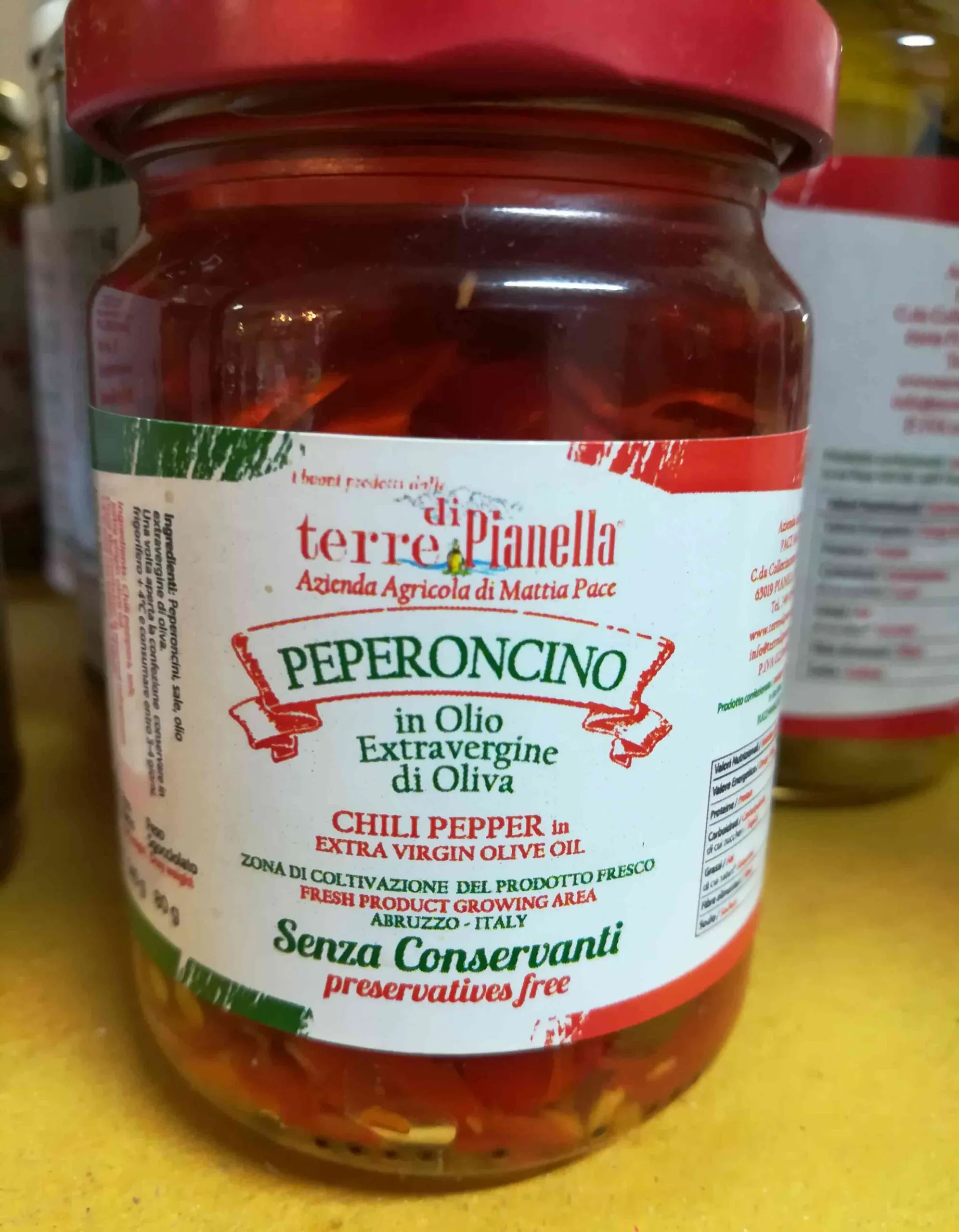 Il peperoncino sott’olio dell’Azienda Terre di Pianella è un mix di tradizione e genuinità. Viene lavorato secondo usi che si tramandano da generazioni, per portare sulla vostra tavola gli antichi sapori di un tempo. È realizzato secondo le antiche ricette utilizzando i migliori prodotti di stagione e l’olio extravergine di oliva.
