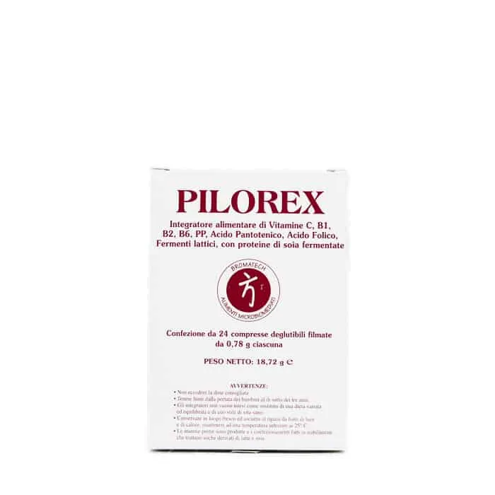Ingredienti PILOREX – Bromatech: Proteine di Soia fermentate da Lactobacillus Bulgaricus (77%); Antiagglomeranti: carbossimetilcellulosa sodica, cellulosa microcristallina, magnesio stearato, biossido di silicio; calcio carbonato; vitamina C; Lactobacillus Acidophilus LA14; Vitamina C, Vitamina PP; calcio pantotenato; Agente di rivestimento: Idrossipropilcellulosa; vitamina B2, vitamina B6, vitamina B1; Acido Folico.