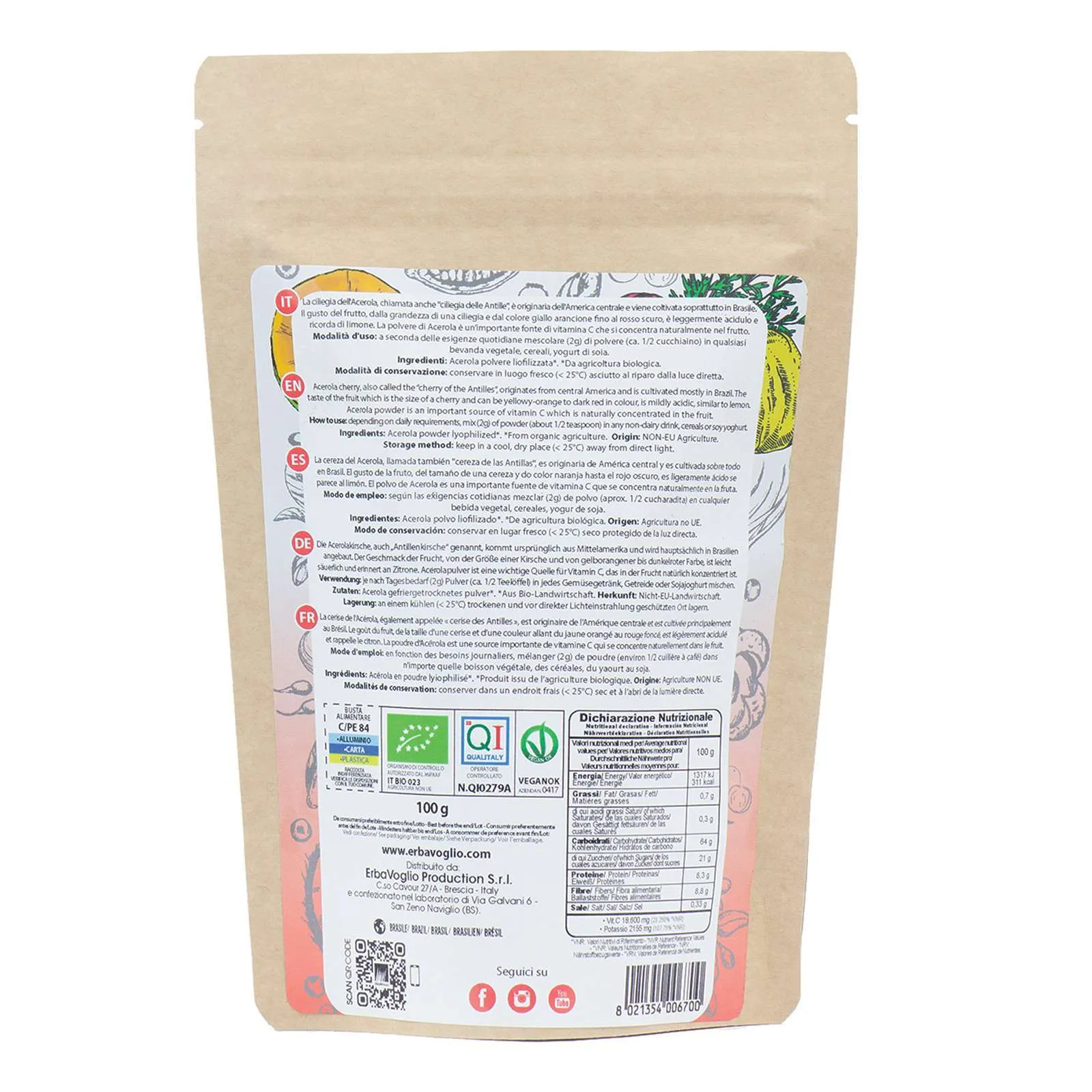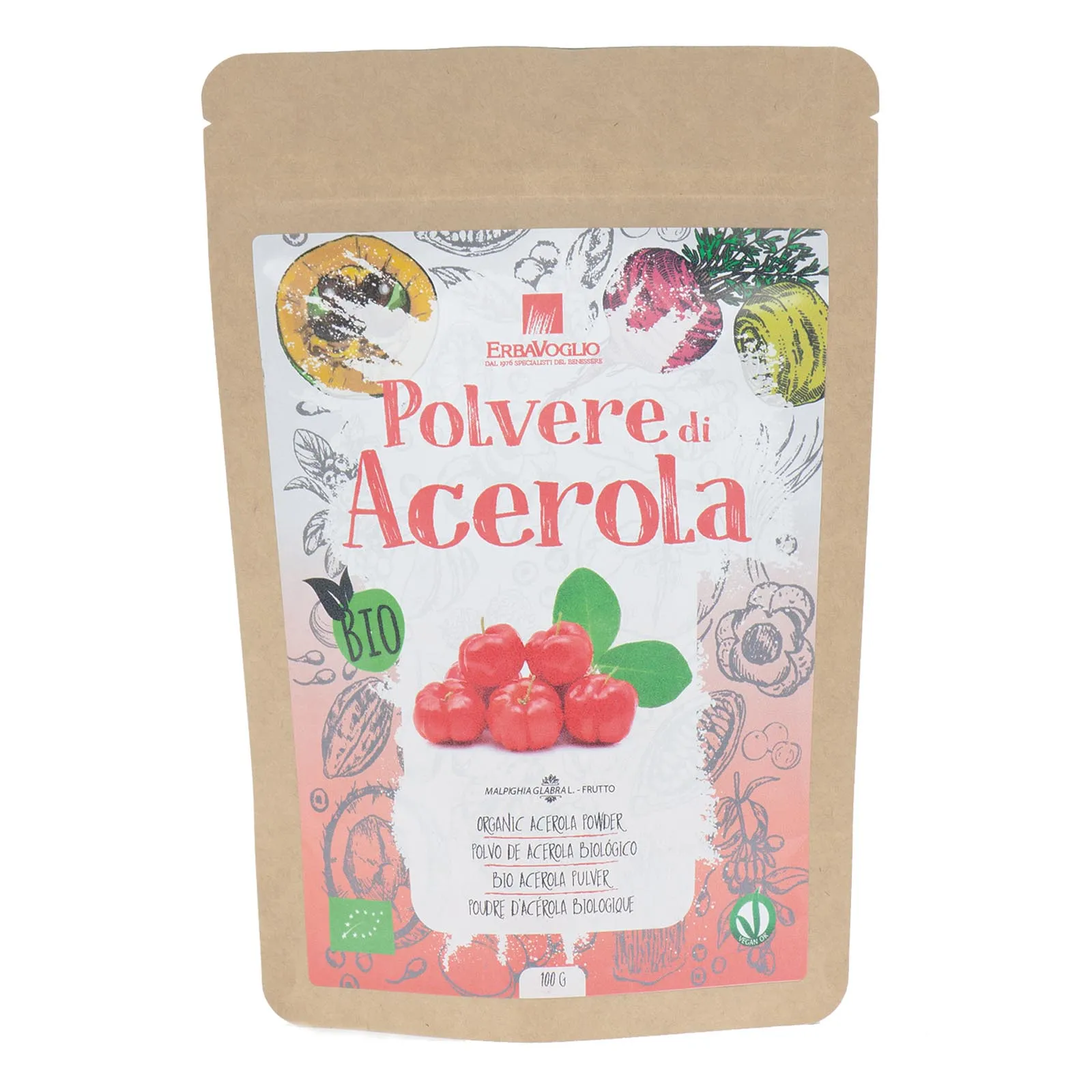 L’Acerola è uno dei frutti più ricchi di vitamina C ed è coltivata biologicamente. Questa polvere solubile ha un sapore leggermente acidulo ed è estremamente versatile in cucina.