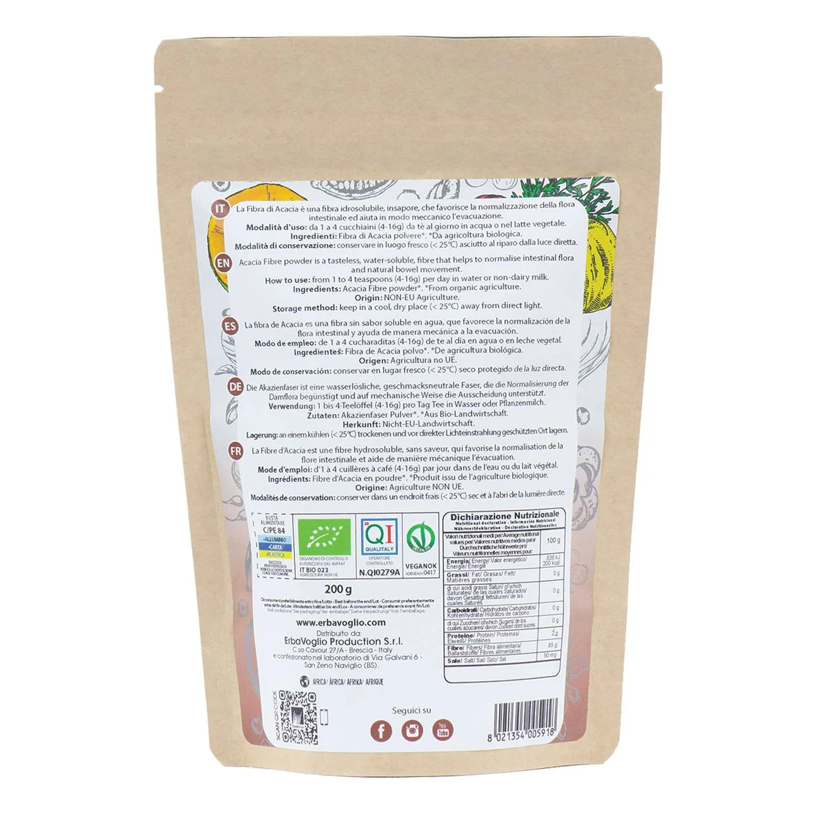 La Fibra di Acacia è un prebiotico naturale utile per il benessere del tratto digestivo. Proveniente da agricoltura biologica, questa fibra idrosolubile è ricavata dalla linfa dell’Acacia Africana ed è insapore, priva di additivi e coloranti.