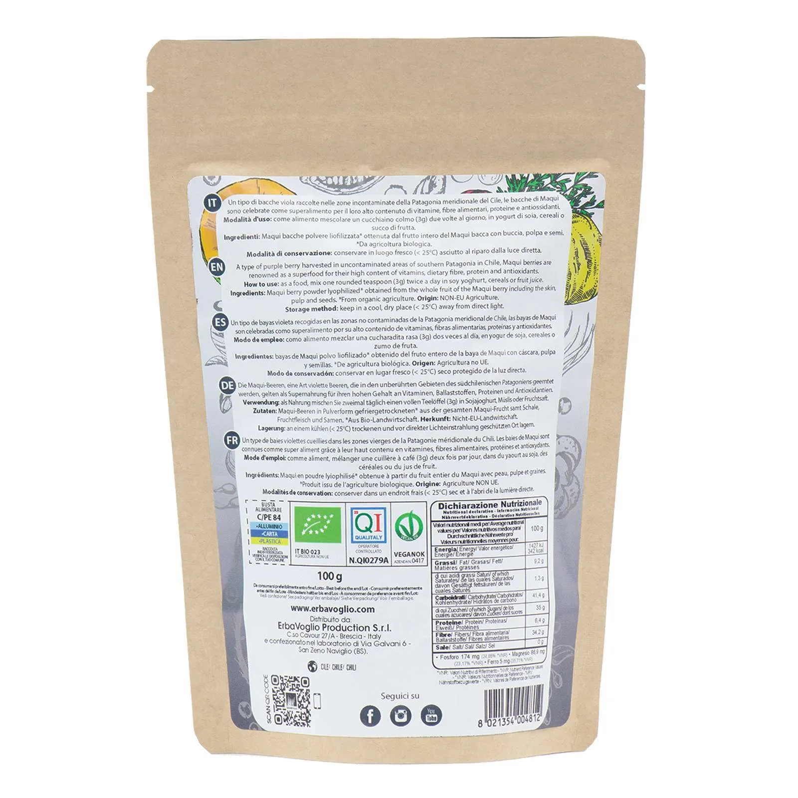 La polvere di Maqui è ottenuta dai piccoli frutti viola dell’Aristotelia chilensis, una pianta che cresce spontaneamente nelle regioni incontaminate della Patagonia. Questa polvere pregiata, proveniente da agricoltura biologica, è naturalmente ricca di polifenoli e antociani, composti noti per le loro proprietà benefiche. Dal sapore piacevolmente fruttato e leggermente acidulo, si scioglie facilmente in succhi, frullati e yogurt.
