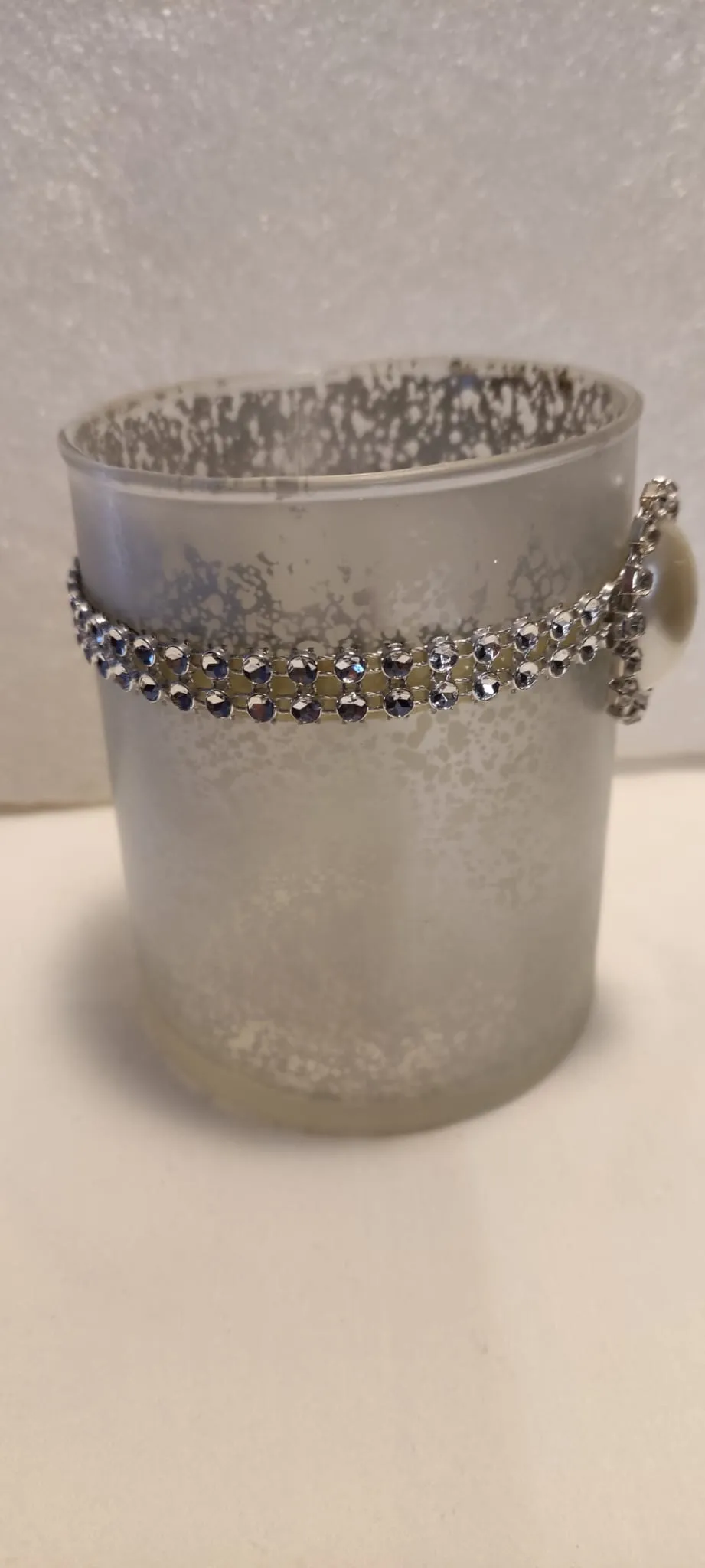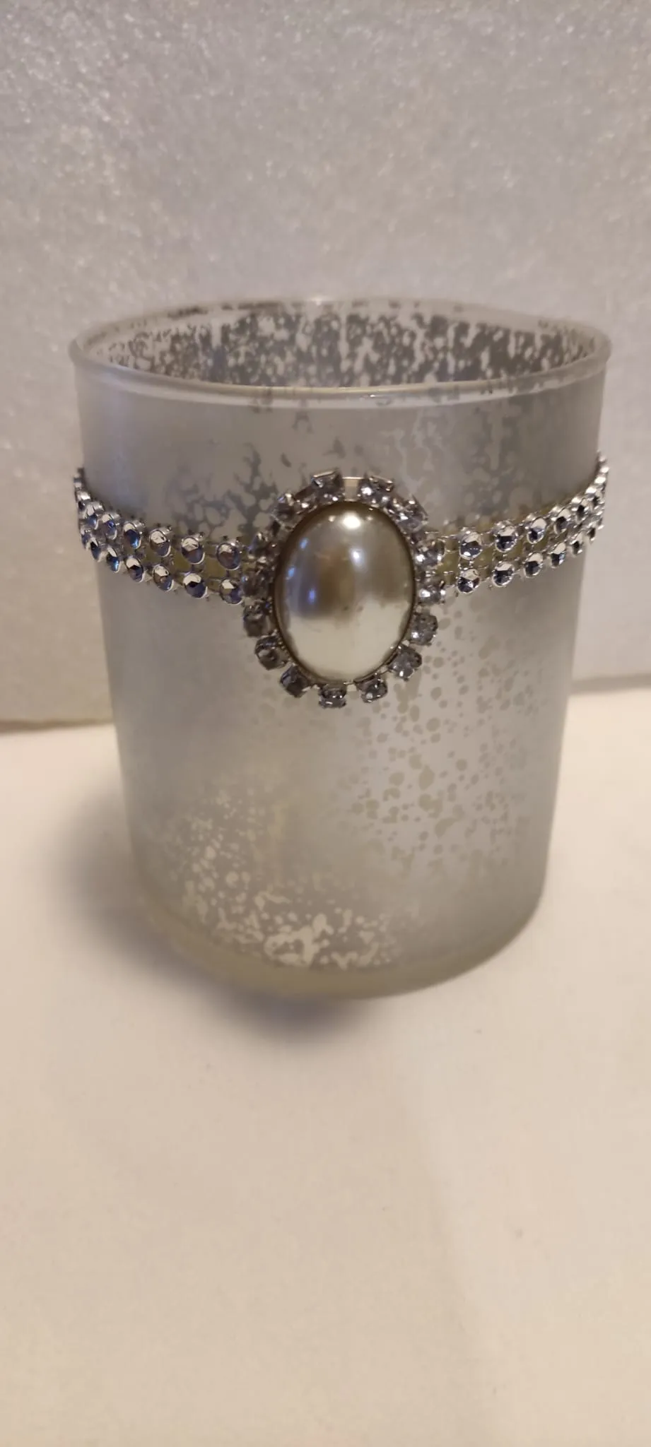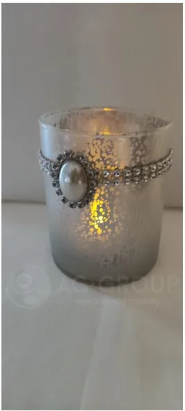 Porta candela in vetro anticato, con strass e perla nel bordo. Grazie alla qualità del vetro si ha un’effetto della luce ombreggiante per un’atmosfera magica.