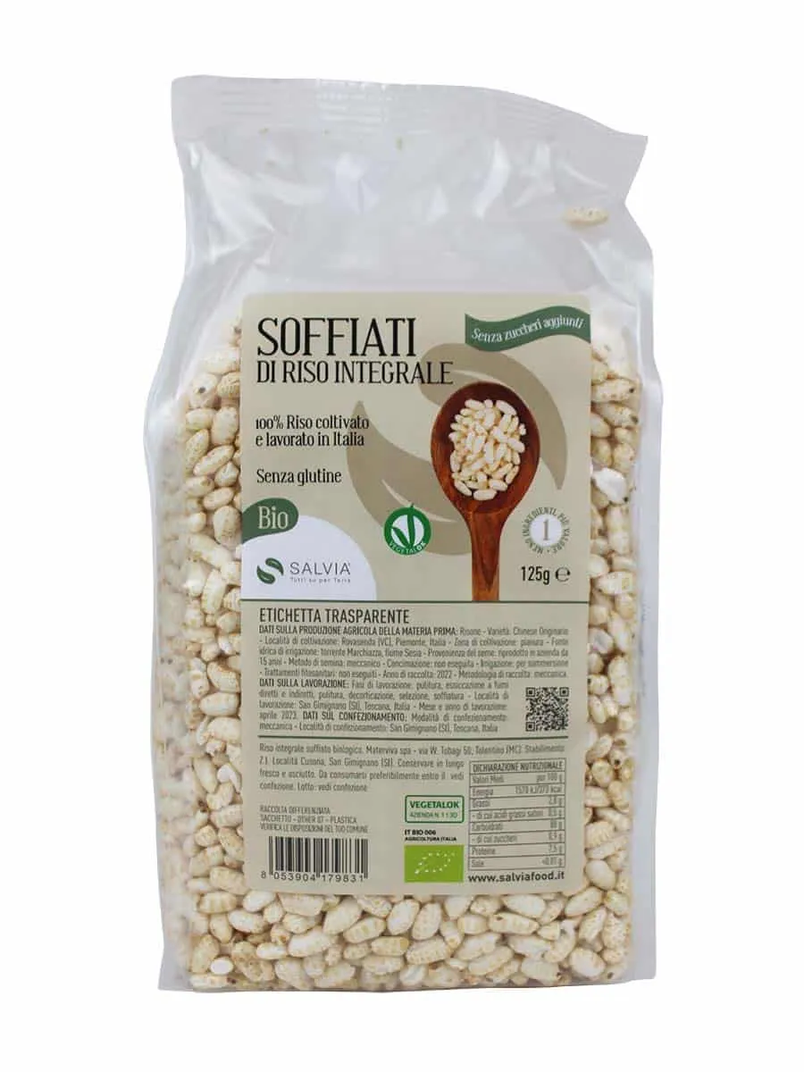 I soffiati di riso integrale Bio sono un prodotto semplice e di origine vegetale. Sono prodotti infatti con riso integrale biologico italiano, proveniente da nostre filiere controllate, senza aggiunta di nessun altro ingrediente, nemmeno l’olio di girasole che normalmente si utilizza per rendere visivamente il soffiato più lucido e attraente.