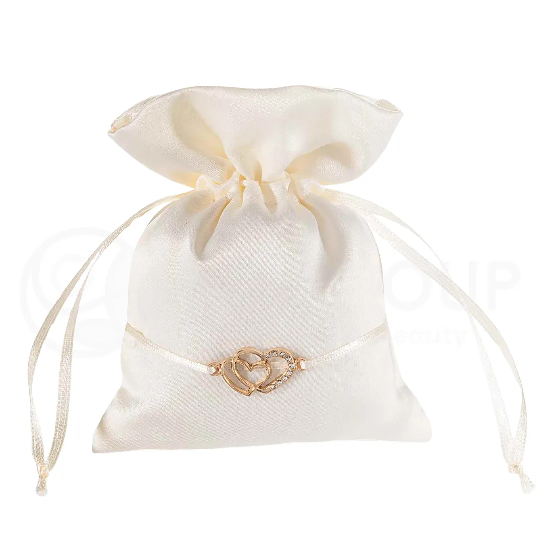 Sacchetto effetto raso con cuori in metallo dorato e tirante