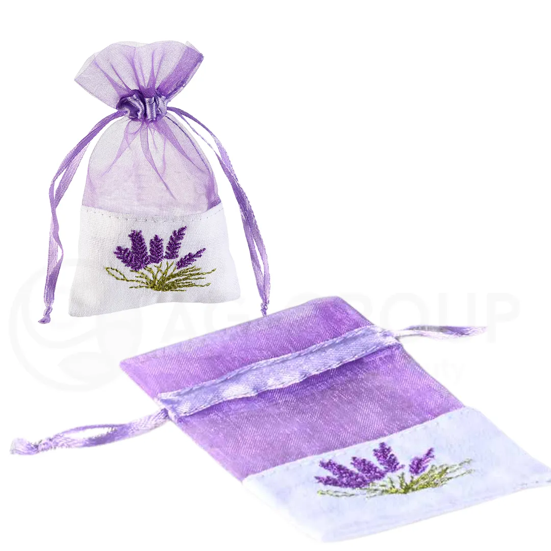 Questi incantevoli sacchetti sono la soluzione perfetta per confezionare bomboniere, piccoli regali, profumati pot-pourri o preziosi oggetti personali con un tocco di sofisticata semplicità. La combinazione della naturalezza del cotone e della trasparenza eterea dell’organza crea un contrasto visivo affascinante, mentre il ricamo stilizzato di lavanda evoca la serenità e il profumo inebriante dei campi provenzali.