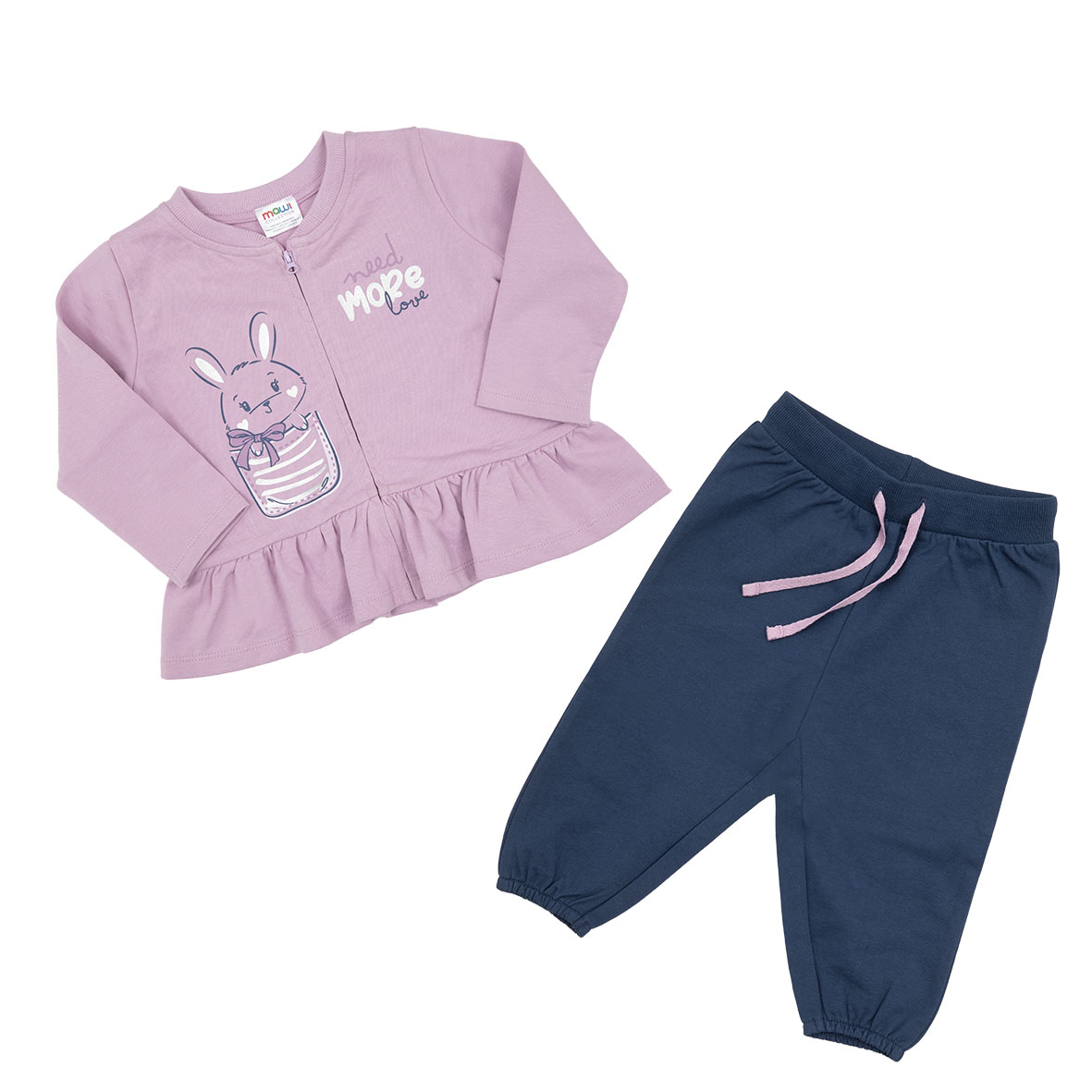 Set due pezzi felpa più pantalone da bambina. Il capo superiore si presenta in tinta unita lilla con stampa grande sul davanti zip intera e girovita morbido, il capo inferiore si presenta in total blu scuro con particolari a richiamo. La vestibilità è morbida e regolabile grazie a elastico in girovita e sulle caviglie. Accessori non in vendita. La confezione contiene solo il capo d’abbigliamento