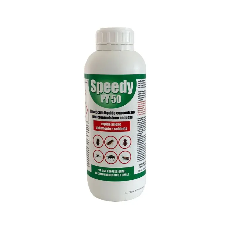 Speedy Py 50 è un insetticida liquido concentrato dotato di rapida azione abbattente e snidante per il controllo di insetti volanti e striscianti, a base di solo piretro, principio attivo naturale a bassissima tossicità nei confronti dell’uomo e degli animali a sangue caldo. Speedy Py 50 è formulato in microemulsione acquosa, senza impiego di solventi, progettato per la salvaguardia dell’ambiente, la tutela degli operatori e degli utenti presenti nelle aree sottoposte al trattamento. Il formulato in microemulsione acquosa è stato studiato per migliorare la stabilità del principio attivo e aumentare la velocità d’azione nei confronti di un elevato numero di infestanti. Può essere utilizzato su tappeti erbosi, siepi, cespugli, viale alberati per la lotta contro le zanzare. Può essere miscelato con altri formulati insetticidi compatibili per aumentare l’azione abbattente. La formulazione è inodore, non infiammabile e non corrosiva per le superfici di applicazione.