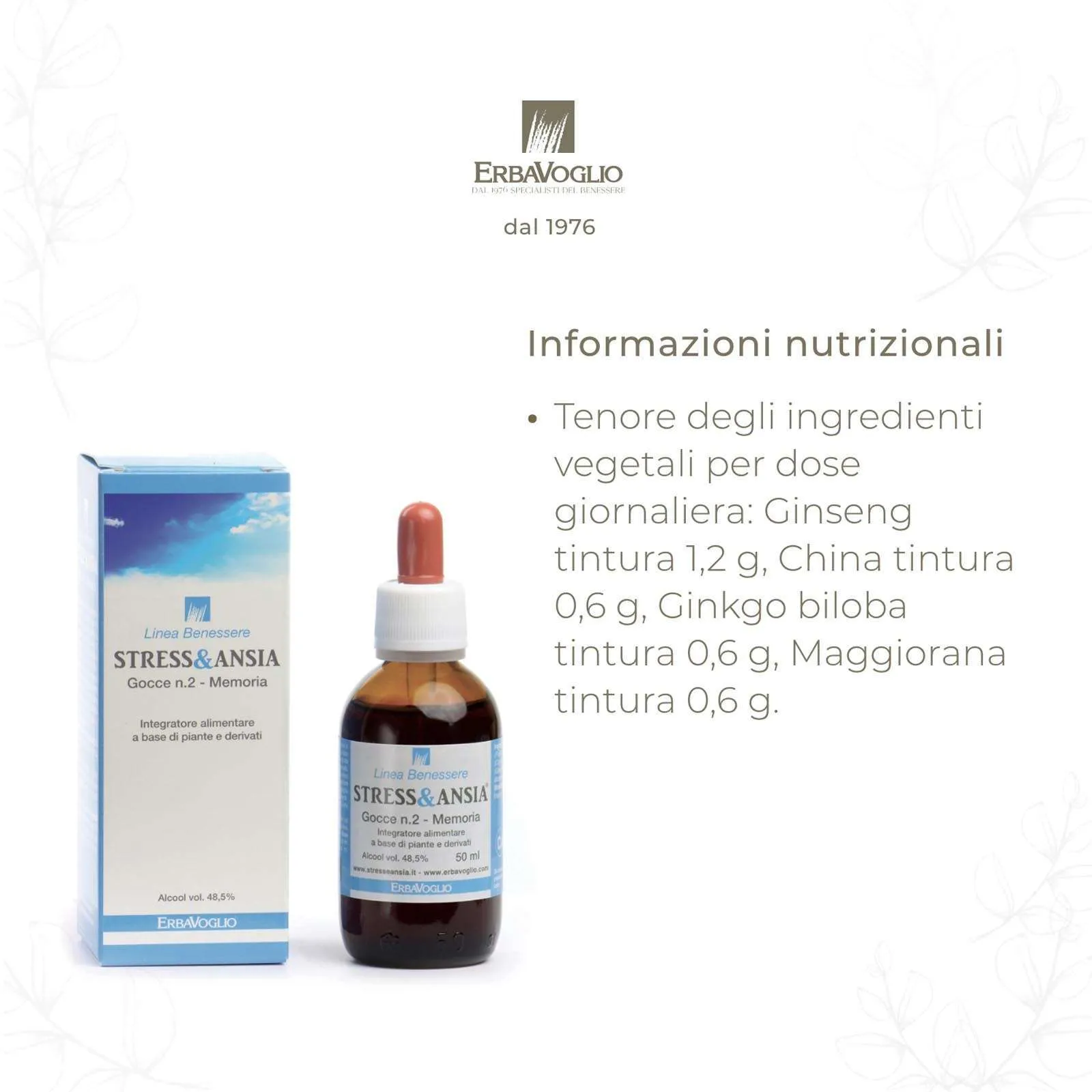 Integratore naturale a base di Ginseng (Panax ginseng), China (Cinchona calisaya), Ginkgo biloba L. e Maggiorana (Origanum majorana), scelto per le sue proprietà tonificanti e antiossidanti. Tutti gli ingredienti provengono da fonti naturali e sono selezionati per migliorare il benessere psicofisico.