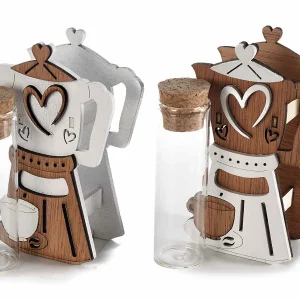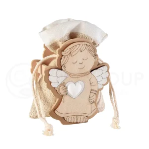 Angelo in legno cuore in gesso e sacchetto juta con tirante