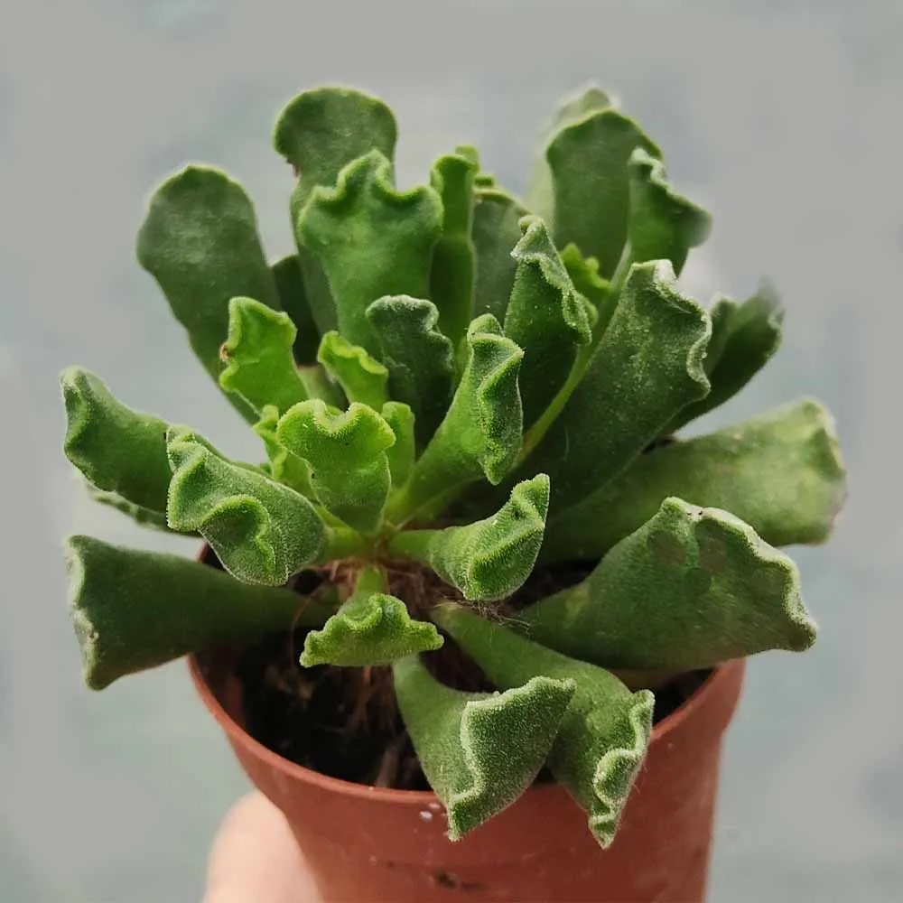 L’Adromischus cristatus è una piccola succulenta nativa del Sud Africa. Questa specie si distingue per le sue foglie carnose e triangolari, spesso ondulate o crenate ai margini, ricoperte da una fitta peluria bianca che conferisce loro un aspetto vellutato e un colore grigio-verde molto particolare. Conosciuto anche come “Crinkle Leaf Plant” o “Key Lime Pie Plant” per la somiglianza del colore delle foglie, è una pianta ideale per piccole composizioni e per arricchire collezioni di succulente insolite e di piccole dimensioni.