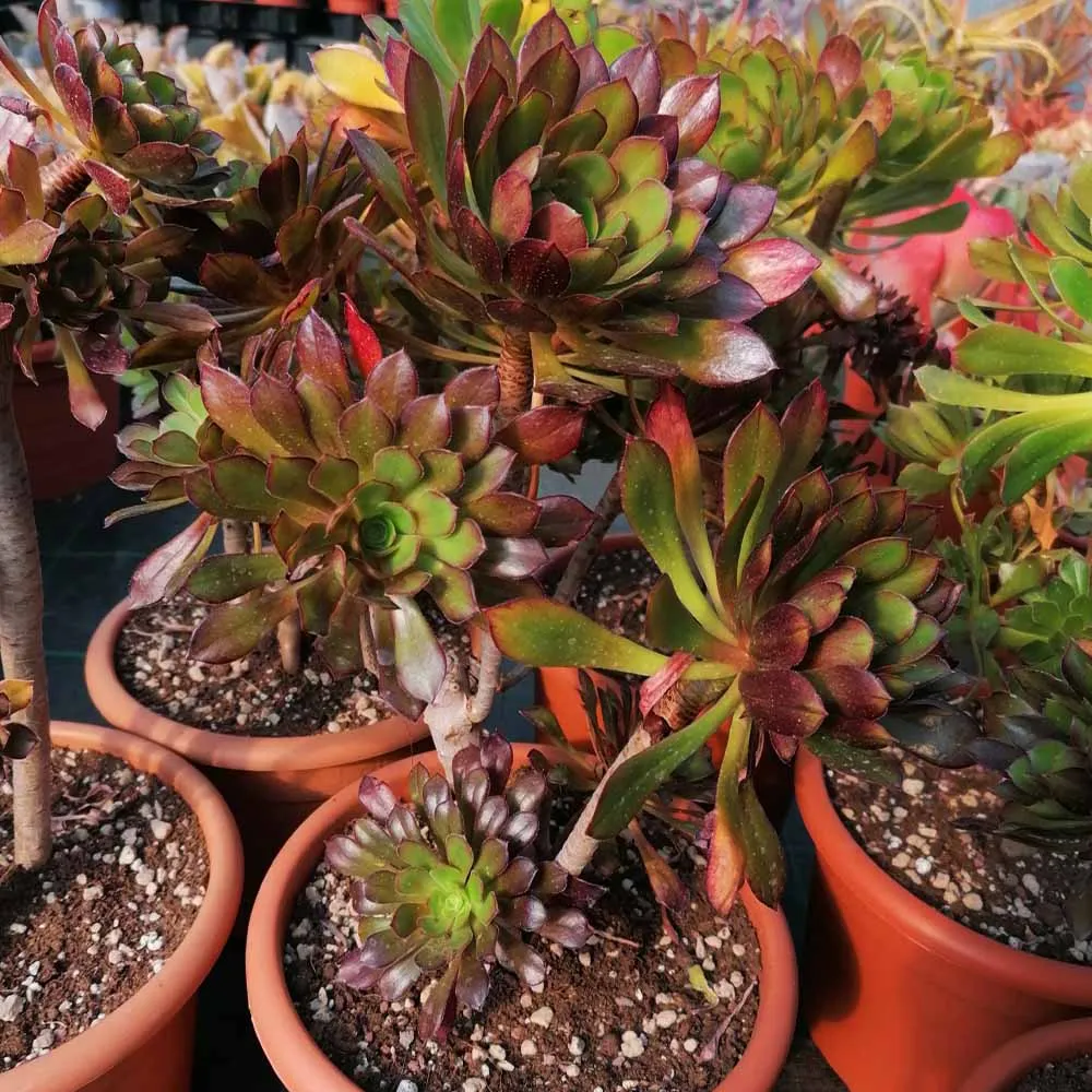 L’ Aeonium atropurpureum è una pianta succulenta a portamento arbustivo caratterizzata da lunghe ramificazioni legnose che terminano in bellissime rosette con colori che sfumano dal verde scuro all’ ebano: le sue foglie cambiano colore a seconda delle temperature e della stagione generando così sempre grande enfasi e curiosità in chi la coltiva. Una pianta affascinante e molto decorativa di facile coltivazione che ben si adatta sia alla vita d’ appartamento sia alla vita in esterno perché in grado di sopportare anche basse temperature fino a 0°C; tale caratteristica la si percepisce anche dal suo nome che in greco significa eterno ed immortale.