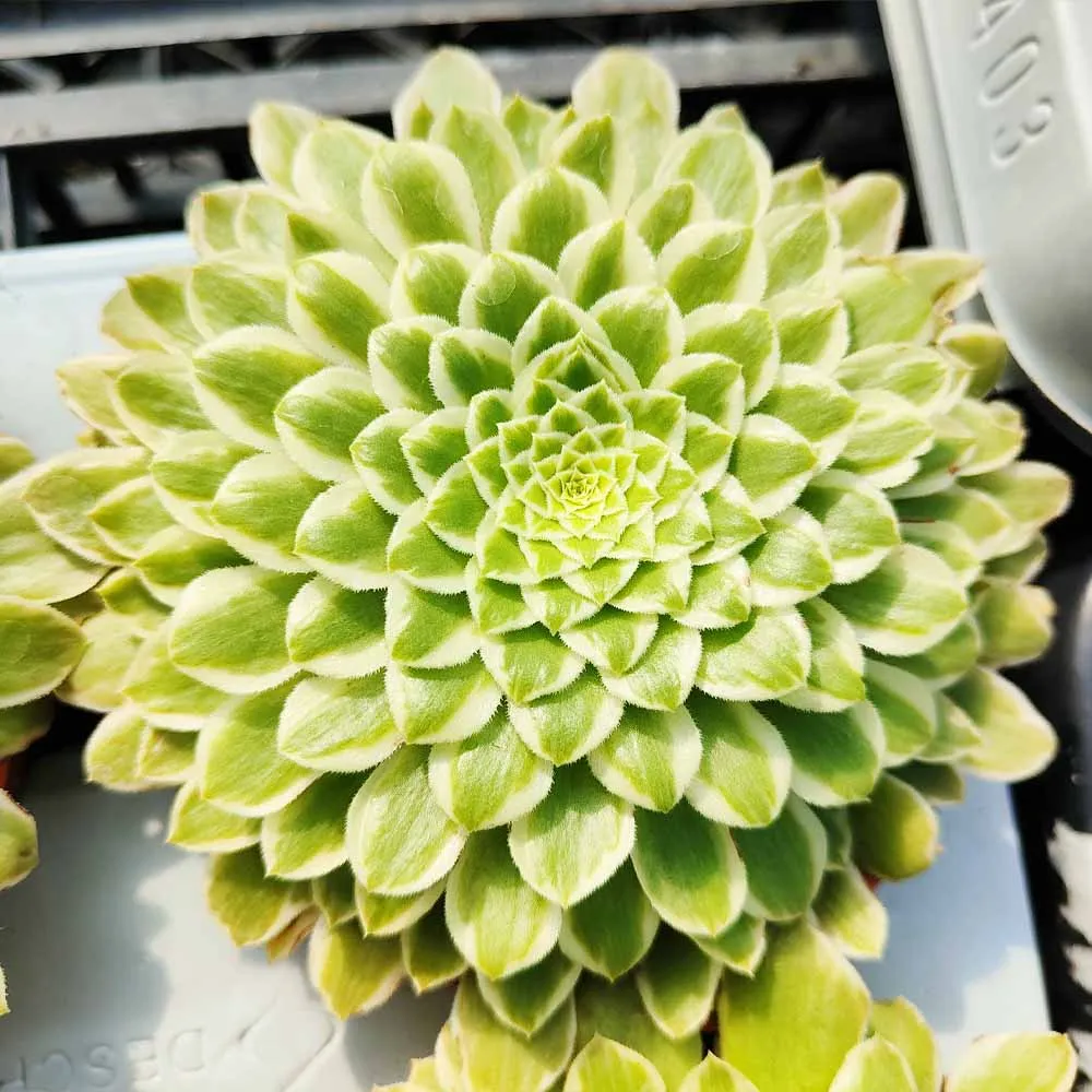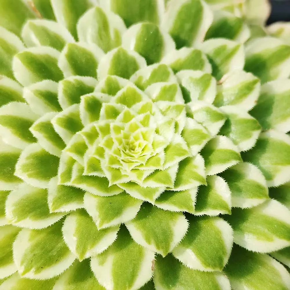L’ Aeonium ‘Emerald Ice’ variegata è una succulenta molto particolare e ricercata per il suo fascino estetico: forma rosette tipicamente solitarie dalle foglie triangoliformi con colore verde e margini giallo bianco perfettamente e geometricamente disposte; tali sfumature danno proprio il nome a questa interessante varietà perchè Emerald fa riferimento alla colorazione verde smeraldo delle foglie ed Ice alla colorazione crema delle sfumature stessa. Da segnalare che durante l’ anno si possono notare rosate nuance in accordo a stagione e temperature. Succulente dalla lenta crescita, ma molto graziosa nel portamento e nello sviluppo , anche per questo ha trovato larga strada come pianta grassa da collezione.