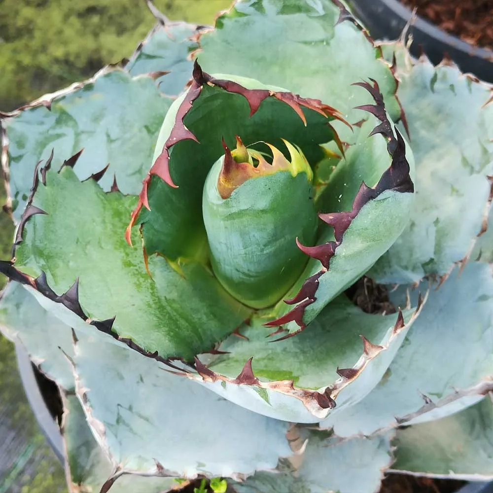 L’Agave titanota ‘White Ice’ si distingue nel regno vegetale come una vera e propria opera d’arte botanica. Questa succulenta di media grandezza, appartenente alla famiglia delle Asparagaceae, cattura l’attenzione con il suo portamento a rosetta e le sue foglie carnose, che si dispiegano in una sinfonia di colori e texture. L’Agave titanota ‘White Ice’ non è solo una pianta resistente e facile da coltivare, ma rappresenta anche un vero e proprio gioiello ornamentale. La sua bellezza scultorea, la sua texture unica e la sua palette di colori suggestiva la rendono un elemento di grande fascino per giardini, terrazze e interni luminosi. Disposta da sola o in composizioni con altre succulente, l’Agave titanota ‘White Ice’ aggiunge un tocco di eleganza e raffinatezza a qualsiasi ambiente. A maturità, questa bellissima succulente, raggiunge un diametro di circa 75 cm; le foglie, disposte a rosetta, sono la vera peculiarità di questa specie. Ampie e carnose, si caratterizzano per una colorazione verde-grigiastro che sfuma delicatamente verso il bianco lungo i margini. Questi margini, ben definiti, sono delineati da un bordo “legnoso” ornato da denti rigidi di colore bianco-brunastro, conferendo alla pianta un aspetto scultoreo e affascinante.