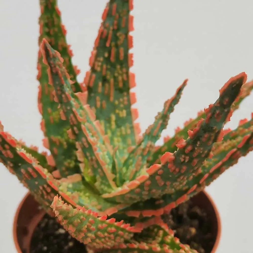 L’Aloe ‘Bright Star’ è un ibrido artificiale ottenuto dall’incrocio tra Aloe marlothii e Aloe vera. Si distingue per le sue foglie carnose, disposte a rosetta e caratterizzate da una forma lanceolata allungata e da una superficie ruvida e tattile. La particolarità di questa aloe risiede nella sua colorazione: le foglie presentano una tonalità verde scuro con macchie bianco rosate irregolari e margini frastagliati di colore rosa acceso che donano alla pianta un aspetto davvero suggestivo. Tra la primavera e l’estate, l’Aloe ‘Bright Star’ produce infiorescenze a spiga che si elevano al di sopra della rosetta di foglie. I fiori, a forma di tubo, sono di colore giallo-arancio, contribuendo al fascino decorativo della pianta. Questa aloe è una succulente di dimensioni contenute, che generalmente non supera i 30 cm di altezza. La sua crescita, inoltre, è piuttosto lenta, rendendola ideale per la coltivazione in vaso, dove può essere esposta su davanzali, mensole o scrivanie, donando un tocco originale a qualsiasi spazio. Queta varietà di aloe è facile da coltivare ed amante di esposizione a mezz’ ombra o luoghi scarsamente illuminati.