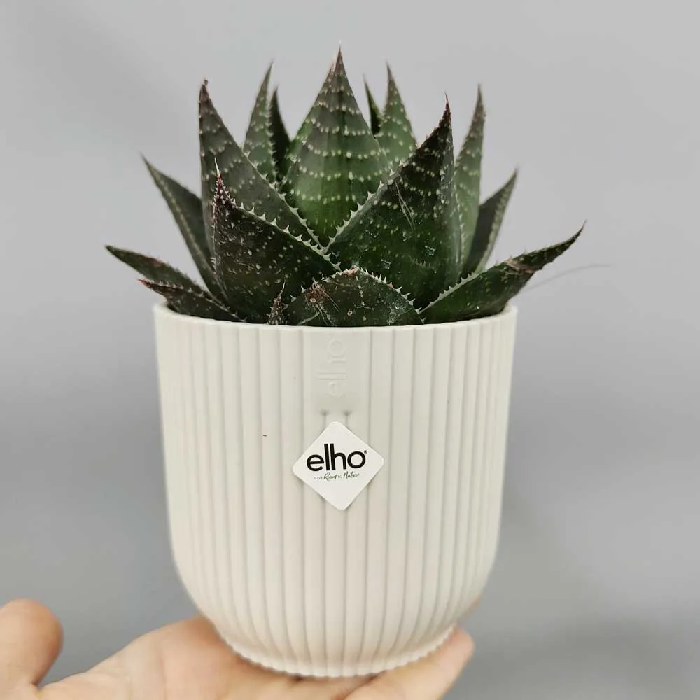 L’Aloe Cosmo è pianta grassa di grande bellezza, molto ricercata e coltivata proprio per la sua estetica ornamentale dalle linee perfette. La pianta sviluppa bellissime rosette compatte dalla lenta crescita con un’ altezza massima di 30cm; il fusto è completamente interrato con foglie triangolari carnose e turgide disposte in cerchio. La coloritura di questa affascinante succulente è un verde intenso molto ricco caratterizzato da leggere puntinature bianche che con l’ esposizione al sole o al freddo diventano rossicce acquistando ancora più pregio; mentre lungo i bordi di ciascuna foglia sono presenti leggerissime e piccole spine biancastre totalmente innocue che rendono l’ aspetto complessivo ancora più ricco e particolare. Danta la lenta crescita e la predilezione per ambienti poco luminosi, fin da subito si è fatta larga strada tra le piante grasse in vaso da interno