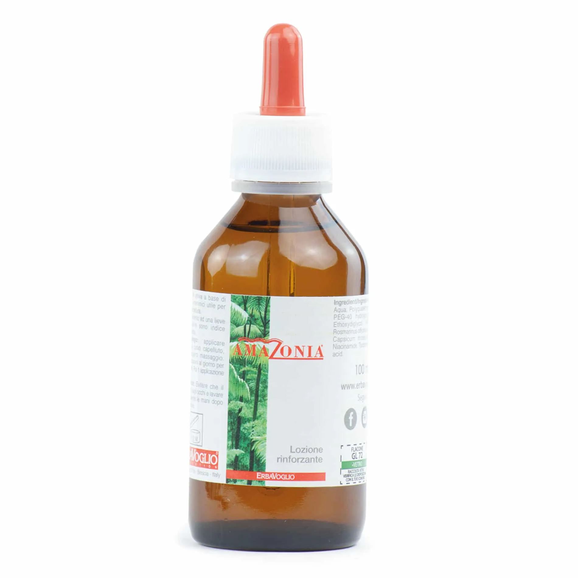 Amazonia Lozione Anti-Caduta agisce come un trattamento preventivo contro la caduta dei capelli, tonificando la cute e rinforzando i bulbi piliferi, senza compromettere l’idratazione e l’elasticità della fibra capillare. La lozione è formulata con Rosmarino, che stimola la microcircolazione e apporta nutrimento alle cellule della cute, e Pantenolo, che supporta l’elasticità e l’idratazione dei capelli. Contiene anche Niacina (vitamina B3), per favorire la rigenerazione cellulare, e Estratto di Capsico, che stimola la circolazione e fornisce nutrimento ai bulbi piliferi.