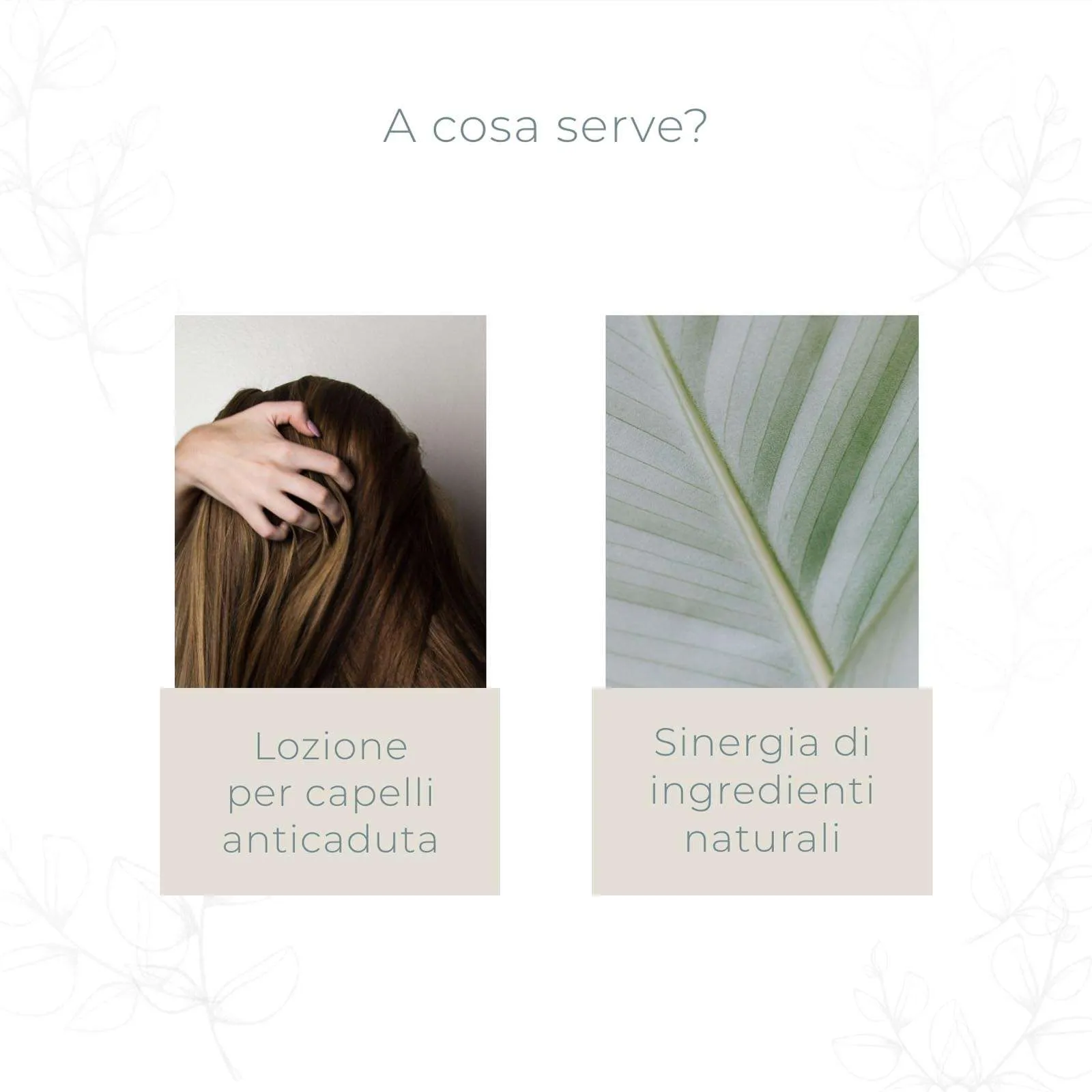 Lozione specifica per capelli anticaduta, arricchita con ingredienti naturali accuratamente selezionati per agire in modo efficace e delicato.