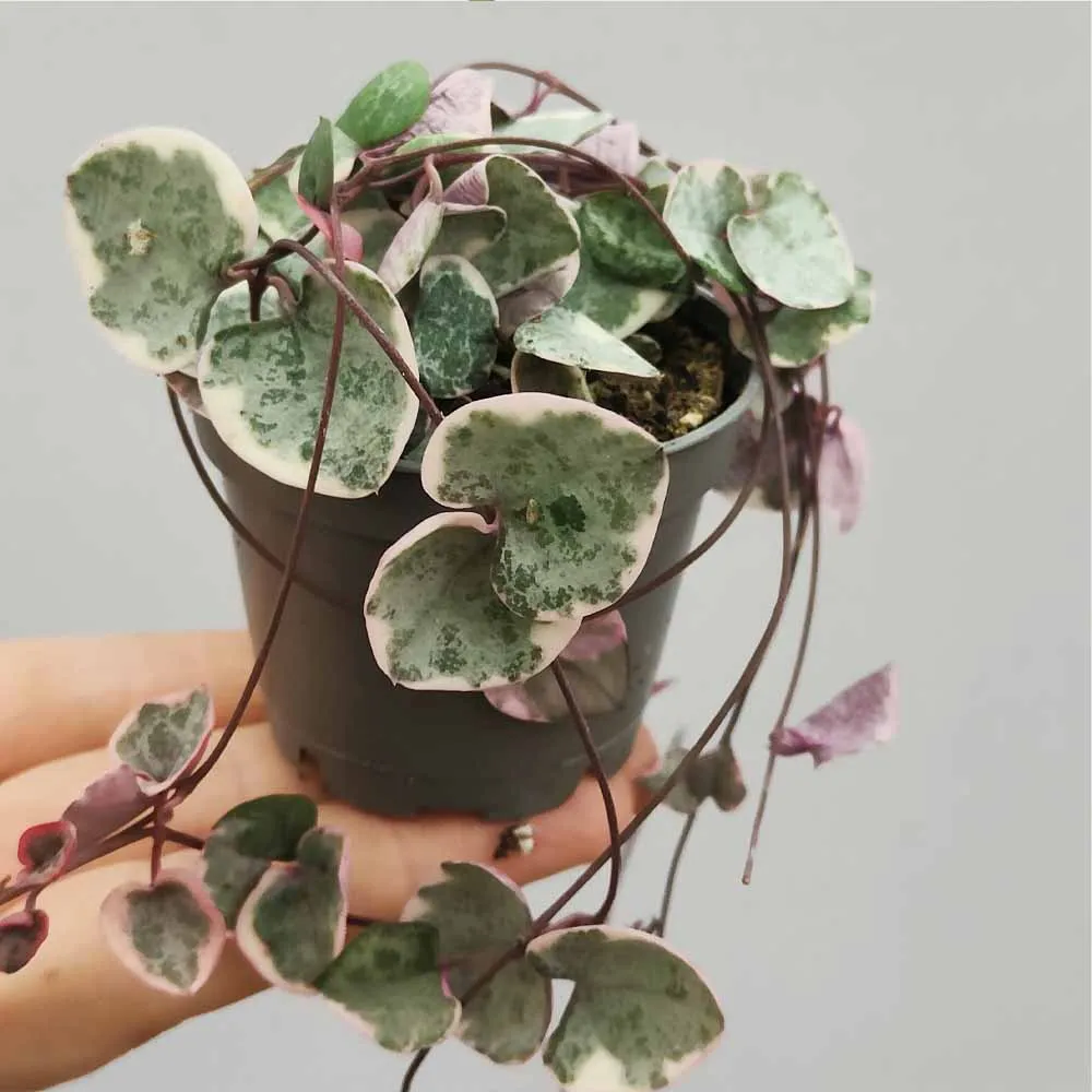 Succulente dal famoso fascino caratterizzata da lunghi steli sottili e flessibili che possono raggiungere notevoli lunghezze, anche superiori al metro. Lungo questi steli si sviluppano a intervalli regolari piccole foglie carnose a forma di cuore, disposte in modo opposto. La variegatura delle foglie è la sua caratteristica più distintiva, presentando un motivo marmorizzato con diverse tonalità di verde, spesso accompagnate da macchie o bordi rosa o crema, creando un effetto visivo delicato e attraente. La pianta produce anche piccoli tuberi aerei lungo gli steli, che possono radicare a contatto con il terreno o essere utilizzati per la propagazione.