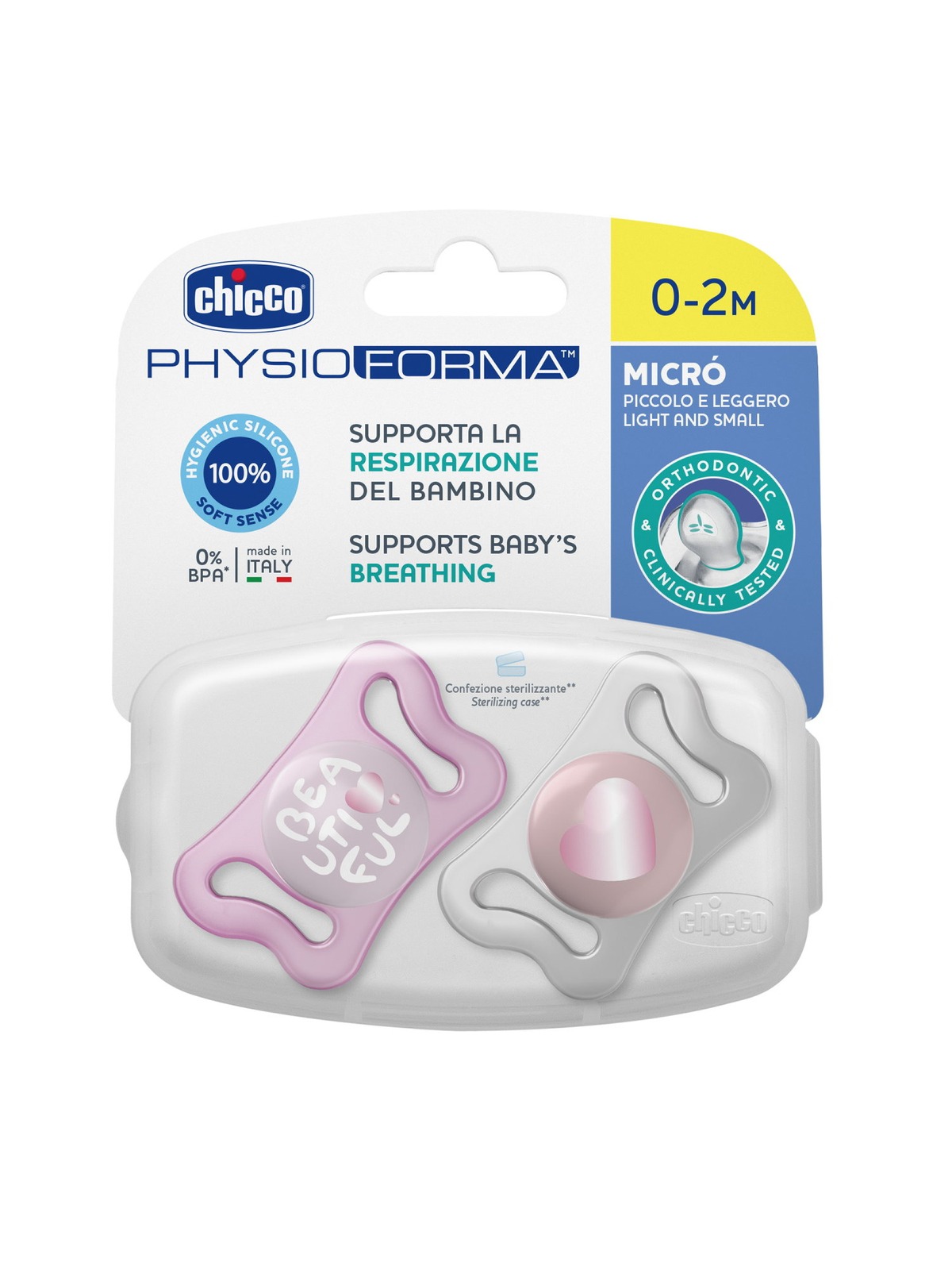 Per ogni neonato la suzione è un istinto naturale: per questo il succhietto svolge un ruolo importante. Leggero, con tettina mini, il succhietto Physio Micrò è stato pensato proprio per i suoi primi due mesi di vita. Il succhietto, così come tutti i succhietti Chicco, ha una tettina ortodontica che favorisce il corretto sviluppo della bocca.