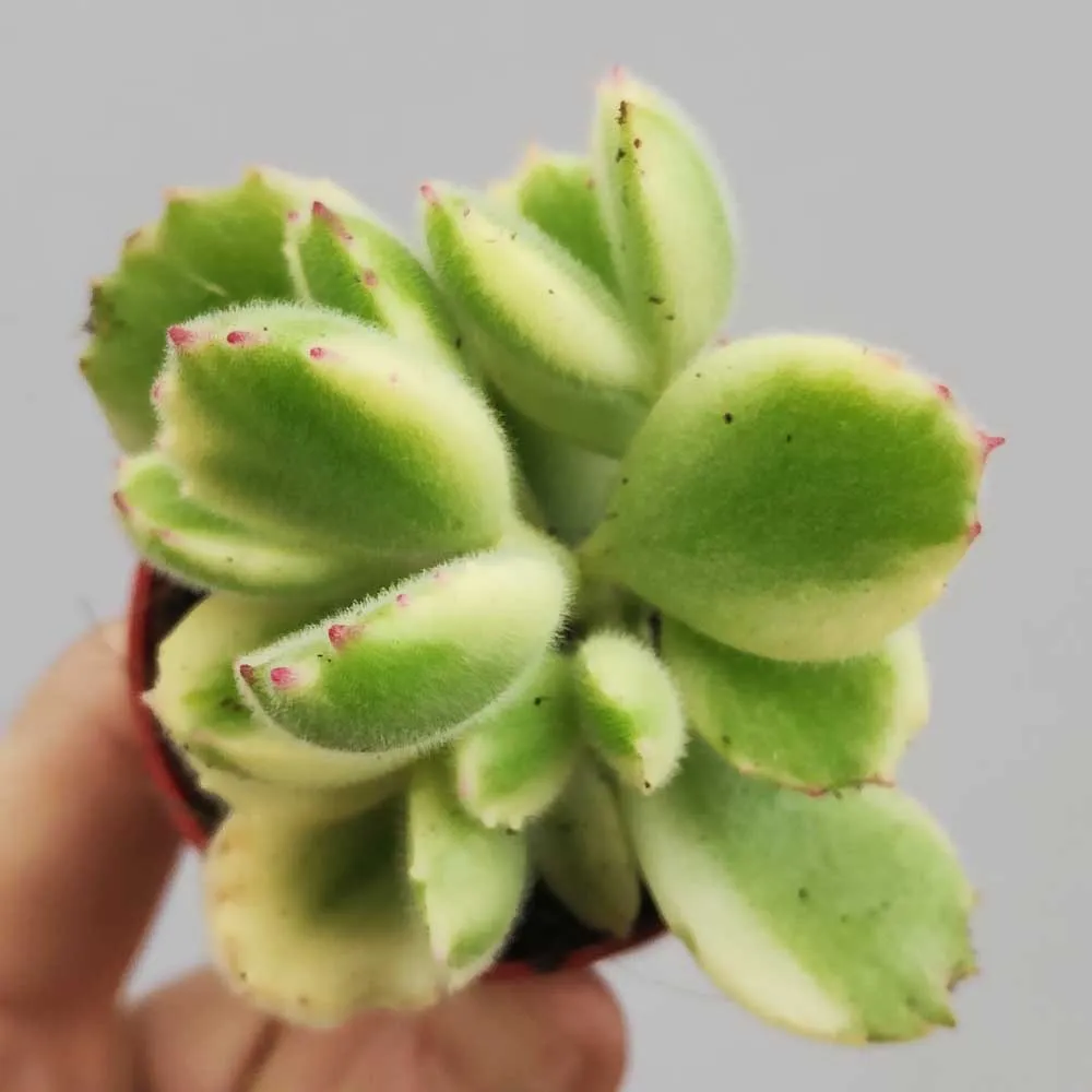 Il portamento del Cotyledon ladismithiensis variegato è arbustivo e compatto, con fusti sottili e ramificati che raggiungono altezze contenute, generalmente non superiori ai 20-30 cm. La caratteristica principale di questa cultivar è la variegatura delle foglie: il colore di base verde è interrotto da macchie o striature di colore giallo crema o bianco, creando un contrasto molto decorativo. Le foglie sono opposte, carnose, di forma ovale o obovata, con l’apice dentellato o ondulato, e ricoperte da una fitta peluria bianca che le conferisce un aspetto vellutato e morbido al tatto. Questa peluria protegge la pianta dalle scottature solari e dalla perdita di acqua. La forma delle foglie ricorda appunto le zampe di un orso, da cui il nome comune.