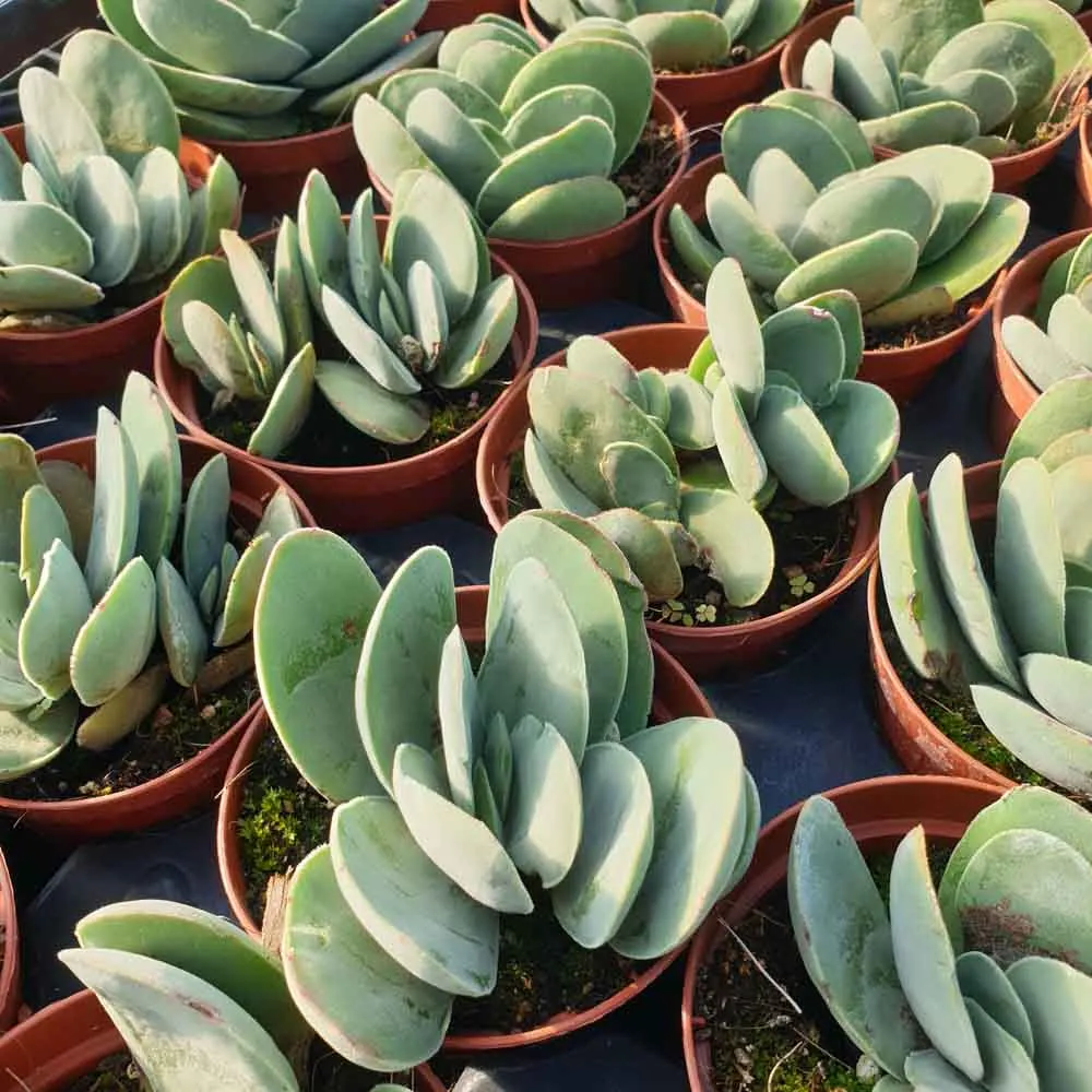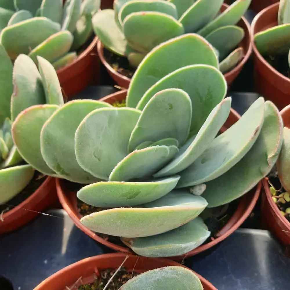 La Crassula cotyledonis , originaria del Sud Africa in particolare della Namibia, viene anche denominata “Crassula Dubia” ed è una succulenta la cui forma strizza l’ occhio alla famiglia Cotyledon; forma cespugli compatti di “rosette” aventi foglie arcuate ed ovoidali carnose e turgide dalla coloritura verde grigio con un portamento tipicamente tappezzante perchè la sua altezza massima è di circa 10/15cm. Le infiorescenze, durante il periodo autunnale, partono dal centro di ciascun fusto con un lungo stelo dal quale nascono piccoli fiorellini a calice di colore verde chiaro. Pianta rustica e facile da coltivare perfetta per essere coltivata in ambienti interni valorizzata da un vaso ornamentale in contrasto per accentuare le sue forme e coloriture.